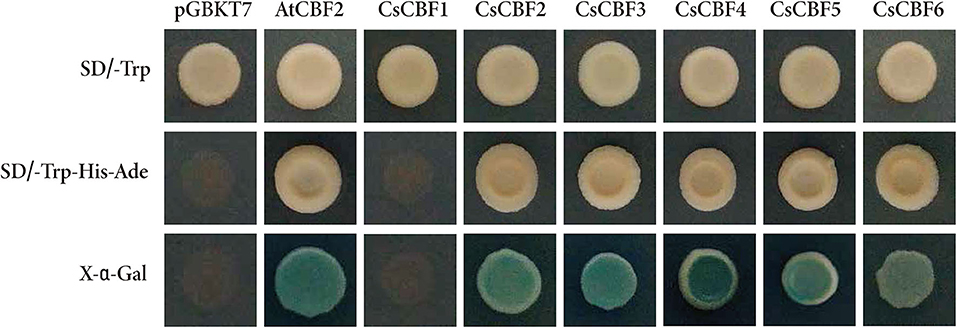 Figure 5. Transcriptional activity analysis of CsCBFs. The entire ORFs of CsCBF sequences were fused to the vector pGBKT7 containing the GAL4 DNA-binding domain. The images in the top row and the middle row show the transformed yeast cells growing on SD medium without Trp and SD medium without Trp, His, or Ade. The bottom row exhibits the α-galactosidase activity of the transformed yeast cells.