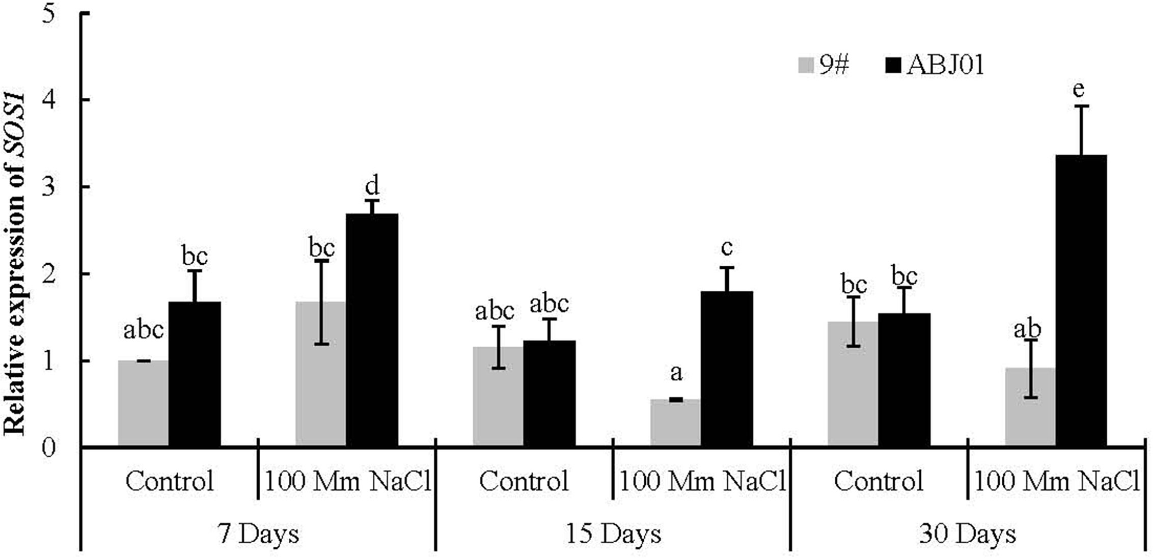 Figure 6 Expression of SOS1 in 9# and ABJ01 under 100 mM NaCl salt stress and normal water conditions (control) for 7 days, 15 days, and 30 days. The data shows mean ± S.E. of quadruplicate experiments. Column with different letters indicate significant differences at p < 0.05.
