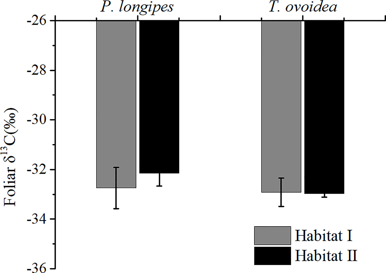Figure 2 showed that species growing in habitat I exhibited similar foliar δ13C values as those growing in habitat II. Specifically, around -32.44 ± 0.67‰ for P. longpies and -32.94 ± 0.36‰ for T. ovoidea. Moreover, leaf δ13C was positively correlated with leaf δ18O across species in habitat I while not in habitat II (Figure 3).