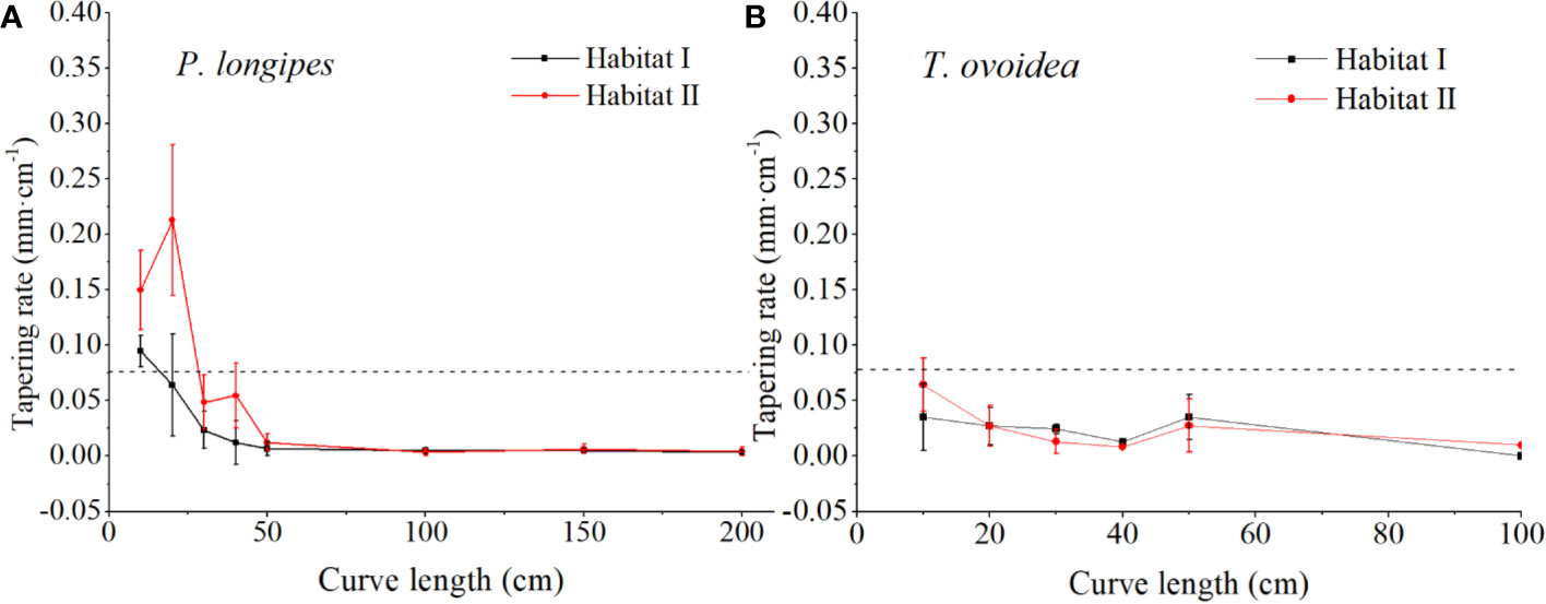 Figure 5 Continuous fluctuation of root tapering rate with increasing root curve length for P. longipes (A) and T. ovoidea (B) growing in the two selected habitats. Error bars represent ± 1 SD. Dotted lines parallel to the axes of the curve length separate root tapering rates greater than or less than 0.075 mm cm-1.