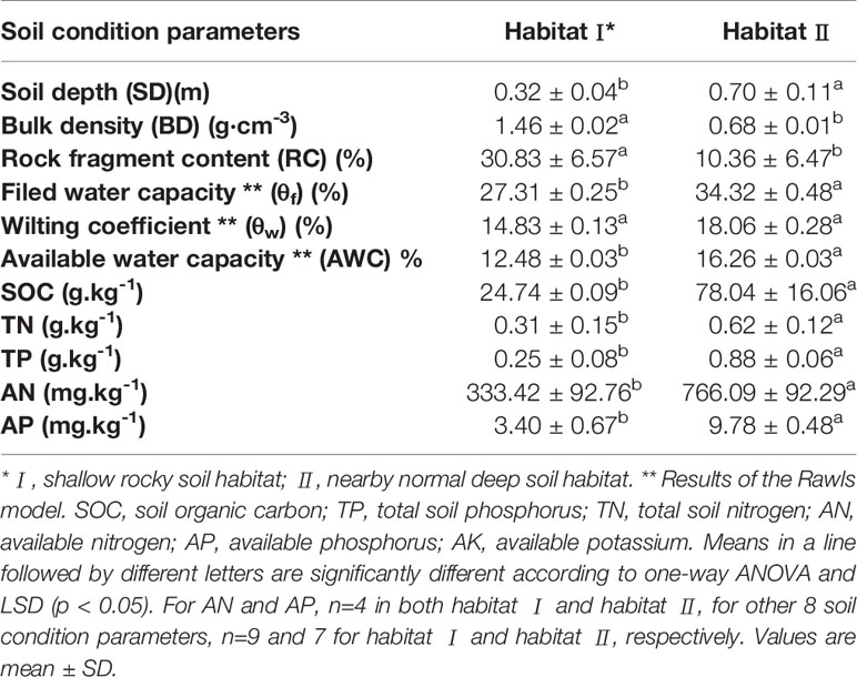 The soil water capacity for the two habitats were cited from the doctoral thesis completed by Fu (2017), which used the grid (80 m × 80 m) sampling method in the studied catchment. In his study, a soil core was used to collect soil samples at five points from the surface (0–15 cm) and around each grid intersection. Parameters such as rock fragment content (RC), soil texture (sand and clay content), and soil organic carbonate (SOC) were measured. It is worth noting that gravel particle sizes that were larger than the diameter of the soil core (38 mm) were generally ignored during sampling. We selected three sample sites around the shallow rocky soil habitat and the nearby deep soil habitat from Fu’s research and then analyzed their mean values of RC, sand and clay content, and SOC to represent the soil physicochemical properties in the two habitats. Rawls model (Rawls et al., 1982) was used for estimating the field capacity and wilting coefficient of soil (0–15 cm) in the sample habitats to reduce laboratory work, and after that, available water capacity (AWC) was calculated accordingly. Multiple regression formulas of Rawls model are as follows: