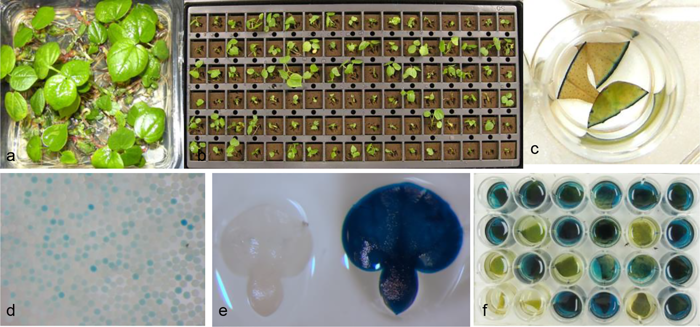 Co-cultured explants were transferred to the optimized shoot regeneration media and carried out as recommended previously (Chen et al., 2014). The regeneration medium consisted of salts and vitamins of Gamborg B5 (Phytotechnology G396), 1.29 g/L calcium gluconate, 20 g/L dextrose, 200 mg/L carbenicillin, 200 mg/L cefotaxime, 100 mg/L Timentin but without the selectable agent, spectinomycin. The medium was solidified with 4g/L agargel. Approximately 0.5 g of explants were surface-plated on the medium in each Plantcon. The cultures were placed in a tissue culture room at 35°C for 3 days before moved to 28°C. All the tissue culture rooms had a photoperiod of 16-light and 8-h dark at an intensity of 100 µmoles/m2/s. Explants with continuously growing green shoots were transplanted to oasis plugs (Jiffy Product of America, Inc.) initially and then transplanted to large soil pots for seed production after they were confirmed transgenic by histochemical assay for GUS. For GUS assay, plant materials were submerged in a 5-bromo-4-chloro-3-indolyl-β-glucuronic acid solution as previously described and incubated at 37°C for 6 h to overnight (Jefferson et al., 1987).