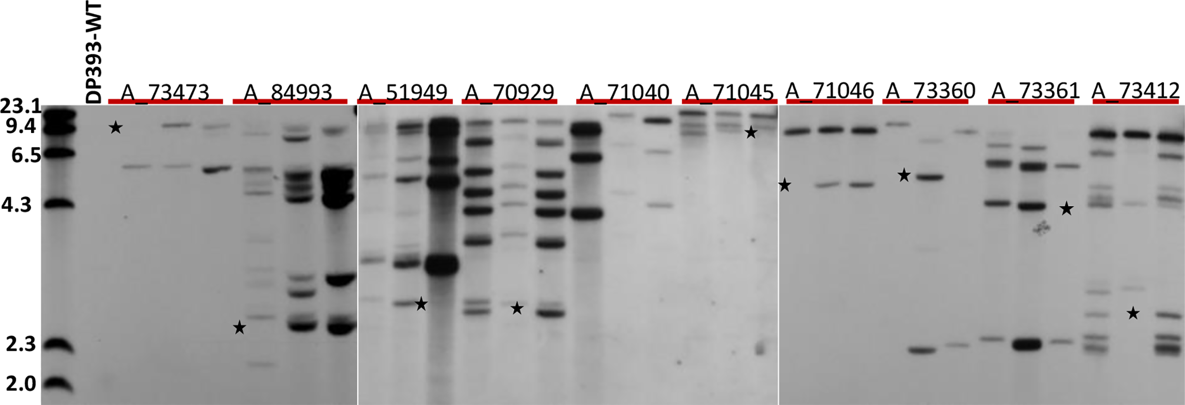 Southern analysis of 30 T1 plants from 10 T0 events. Genomic DNA from 30 T1 progenies of 10 T0 events (3 plants from each T0 event) and non-transformed (DP393 wild type) were digested with Hind III and probed with GUS. The first lane was molecular size marker. * indicates bands that segregates in three progeny plants of each T0 event tested.