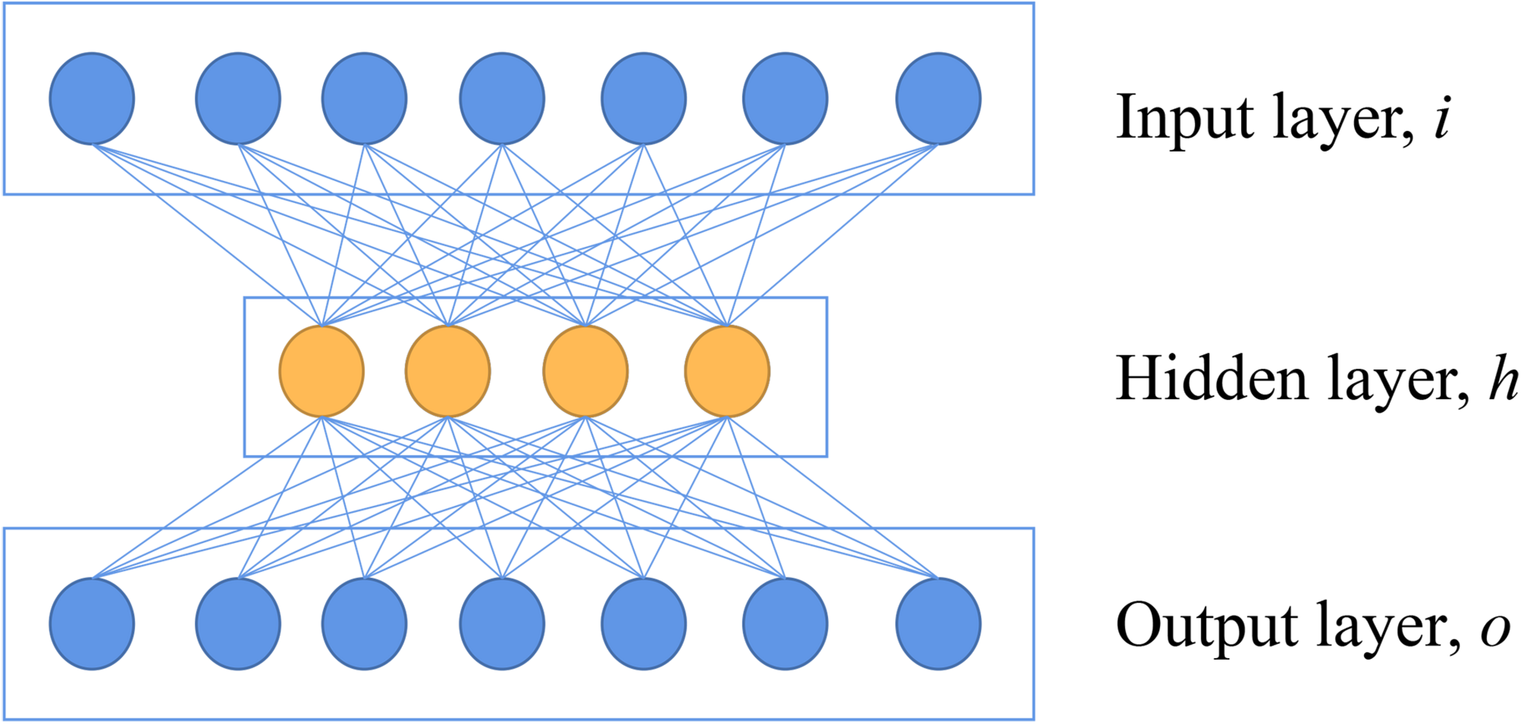 AE is a neural network that reconstructs the value of output to be as the same as possible to the value of the input, which indicates the output layer has the same number of nodes as the input layer (Xing et al., 2016). A basic architecture of AE can be seen in Figure 1. In the encoder part, a basic AE has an input layer of i neurons, which is equal to the dimensionalities of features of the input. A hidden layer with h neurons (h < i) following with the input layer is also introduced. This hidden layer is used to extract features with an activation function. In the decoder part, the h is mapped to an output layer with o neurons (o = i) to reconstruct the input data (Lin et al., 2013). This network is used to reconstruct the original spectra by minimizing the loss of mean squares, which maintains the key information of original data.