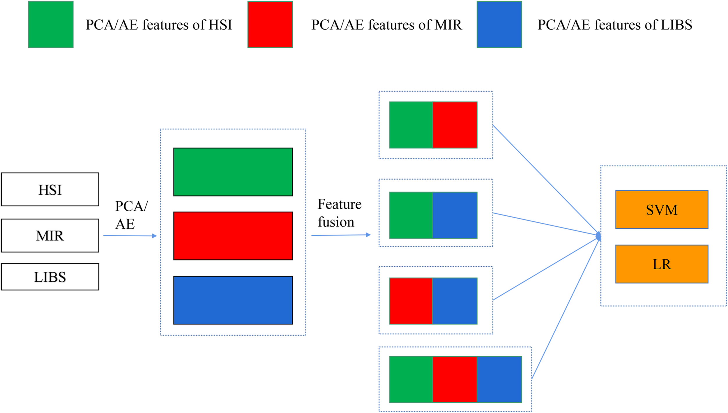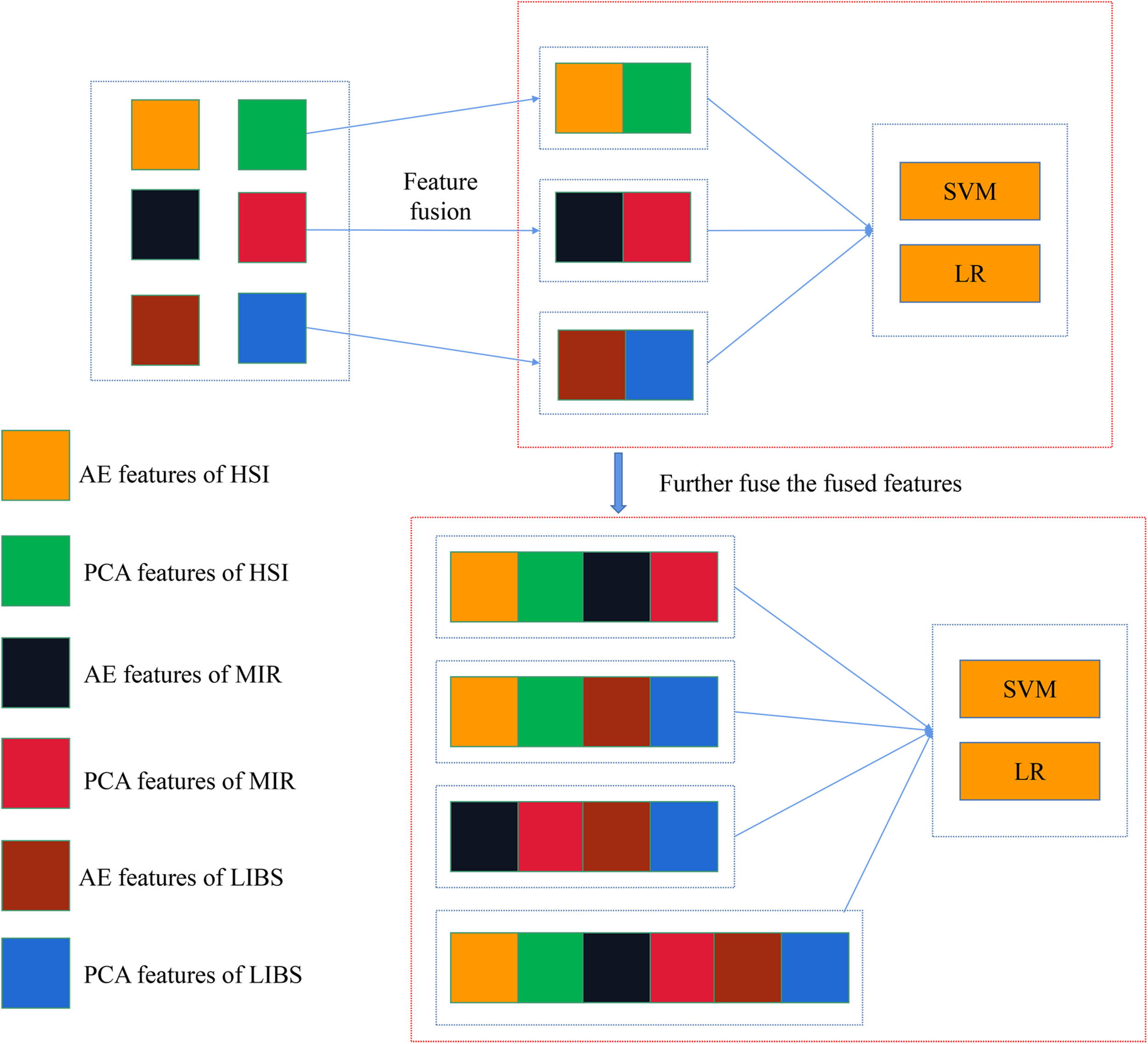 Each preprocessed spectrum of each technique was further implemented with the standardization process before being fed into SVM and LR. This standardization preprocessing standardized features of the training set by removing the mean and scaling to unit variance and performed the same standardization on the validation set and the test set by a utility class StandardScaler in scikit-learn. Concerning modeling with PCA features, the standard preprocessing was also applied. According to self-designed AE, 32 dimensionalities features of HSI spectra extracted by AE were fed into SVM and LR models. Before being fed into SVM and LR, features of the training set, the validation set, and the test set were firstly standardized by the StandardScaler as mentioned before. This standard preprocessing was also applied to AE features of MIR and LIBS. In terms of building CNN, data without the preprocessing of StandardScaler was found to be helpful to achieve better performance. Therefore, each source of spectra, PCA features, and AE features were directly fed into CNN. In terms of features of different levels of fusion, Standardscaler transformation was applied on merged datasets to compensate for the scale differences before feeding these features into classifiers.