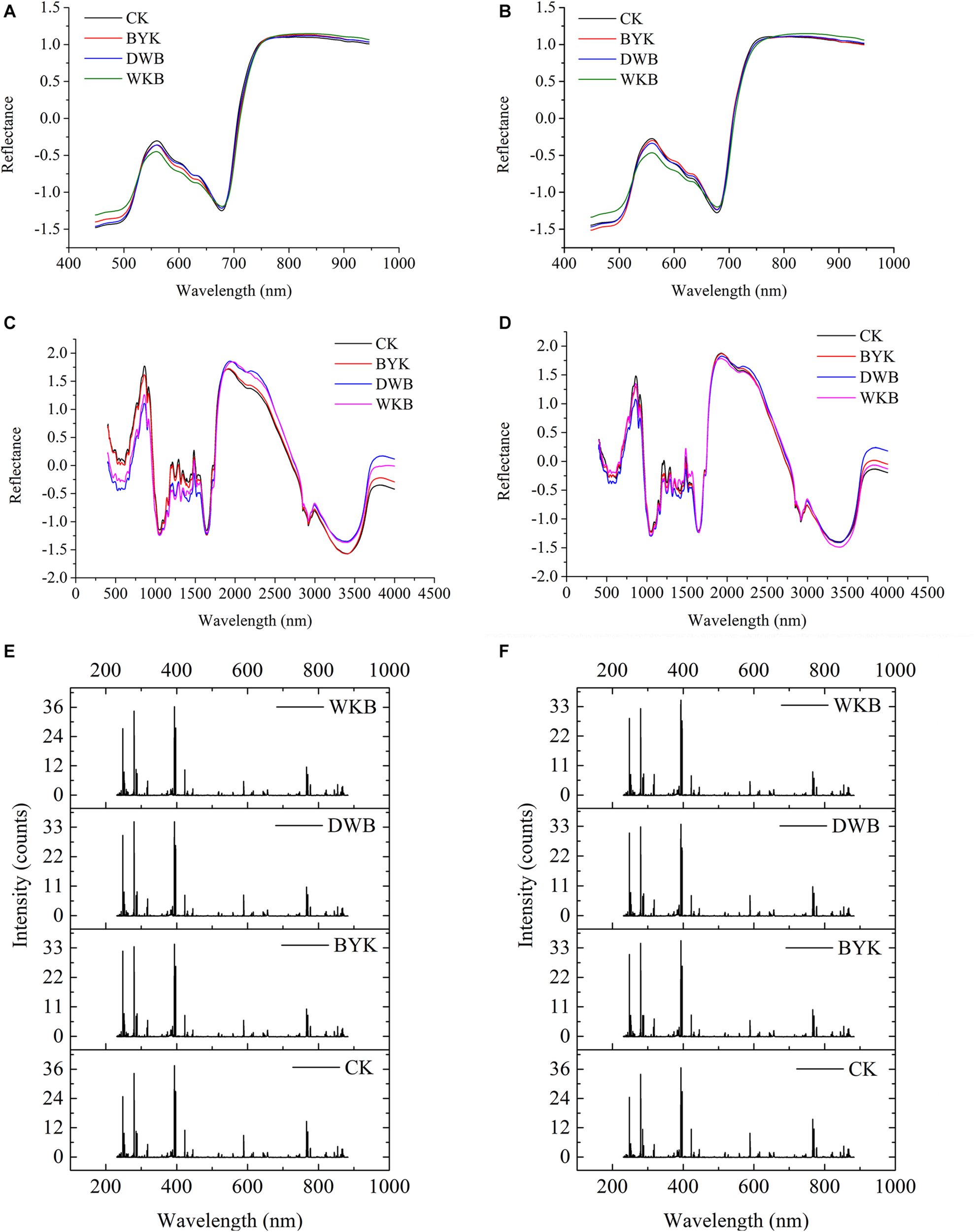 As for LIBS spectra, each peak of LIBS spectra was related to the specific element, which would vary with the change of environmental and intrinsic factors (such as the health condition). With respect to Zhefujing83, the peak intensity of leaves infected by DWB and BYK were smaller than that of healthy leaves. In terms of AD516, the peak intensity of leaves with WKB, DWB and BYK were all smaller than that of healthy leaves.