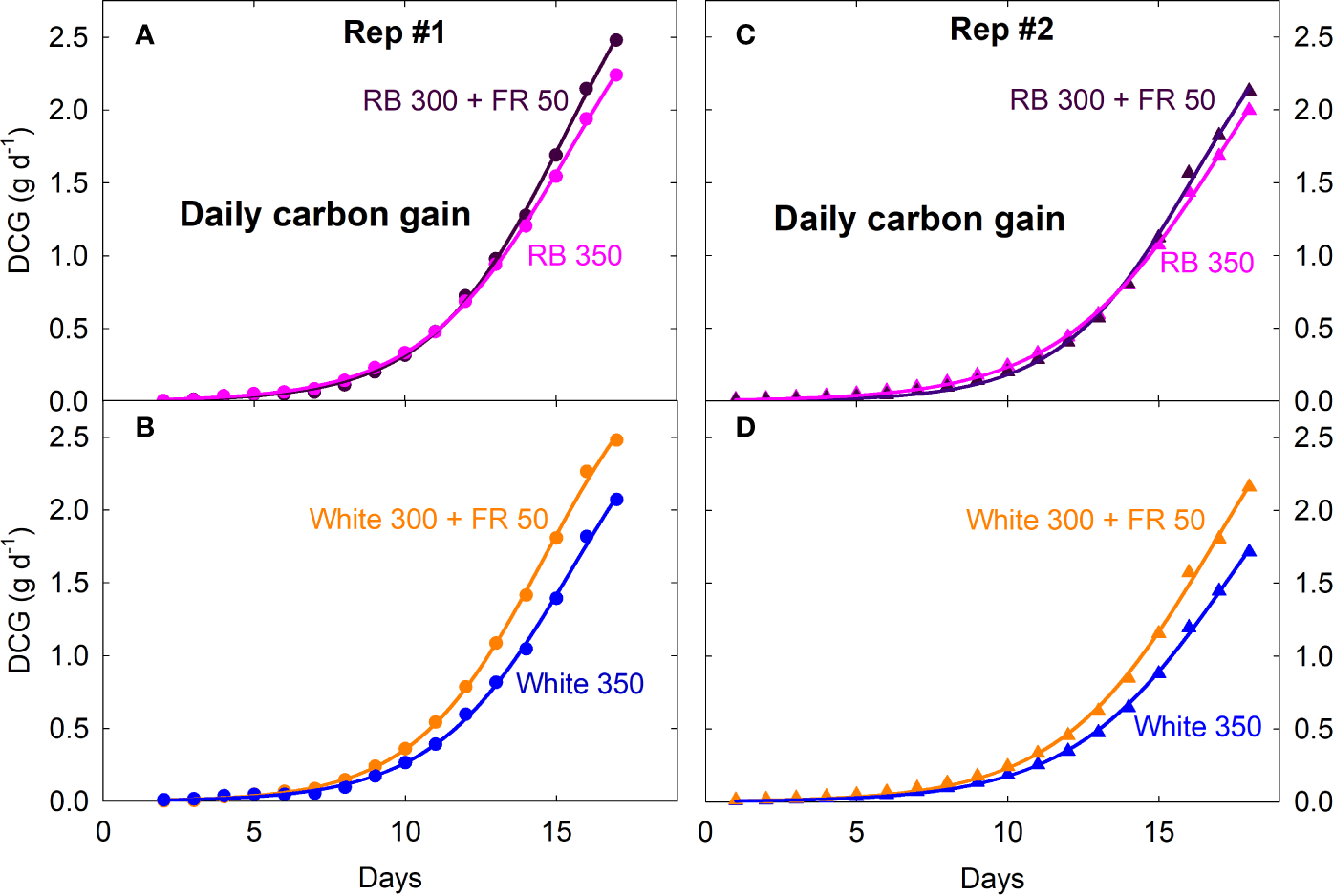 Canopy Pnet, light and Rdark under all four spectral treatments increased exponentially from seedling to young plant stage over the first two weeks, followed by slower increases during the third week as plants quickly approached canopy closure (Figure 2; also see Supplementary Figure S1 for additional dataset). Gas exchange rates were identical among all four treatments when uniformly sized seedlings were first moved into the chambers and remained similar between the white 350 and RB 350 treatments throughout the entire course of the study. Plants grown under the two FR substitution treatments, however, gradually showed higher Pnet, light and Rdark (Figure 2) and gained more carbon per day than the control treatments (Figure 3). These measurements were consistent with the differences in plant dry mass under the four treatments. At harvest, dry mass predicted from the cumulative daily carbon gain obtained from gas exchange measurement was 103.9 ± 3.4% of the measured total dry mass in two representative replicate studies.