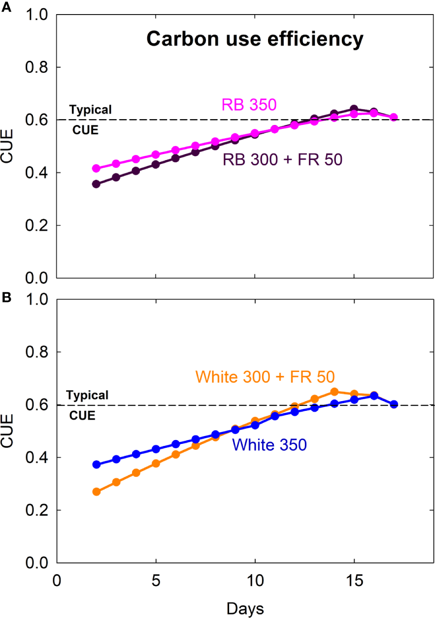 Carbon use efficiency (CUE = daily carbon gain ÷ gross photosynthesis) of lettuce grown under red/blue (RB) and white light, with or without far-red (FR) substitution. The numbers following each type of light (e.g. RB 350) indicate photon flux density in μmol m−2 s−1. Dashed lines indicate a typical CUE value of 0.6 that has been reported for mature plants.