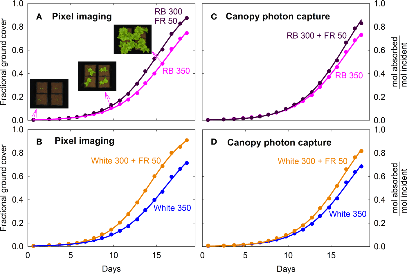 Fraction of ground cover and canopy photon capture of lettuce under four spectral treatments. Fraction of ground cover was obtained from green pixel analysis of top down photos of the canopies. Canopy photon capture (moles of photon absorbed from 400 to 750 nm per mole of incident photons) was estimated from ground cover, leaf photon absorption of the incident spectra and leaf area index. RB, red and blue; FR, far-red. The numbers following each type of light (e.g. RB 350) indicate photon flux density in μmol m−2 s−1.