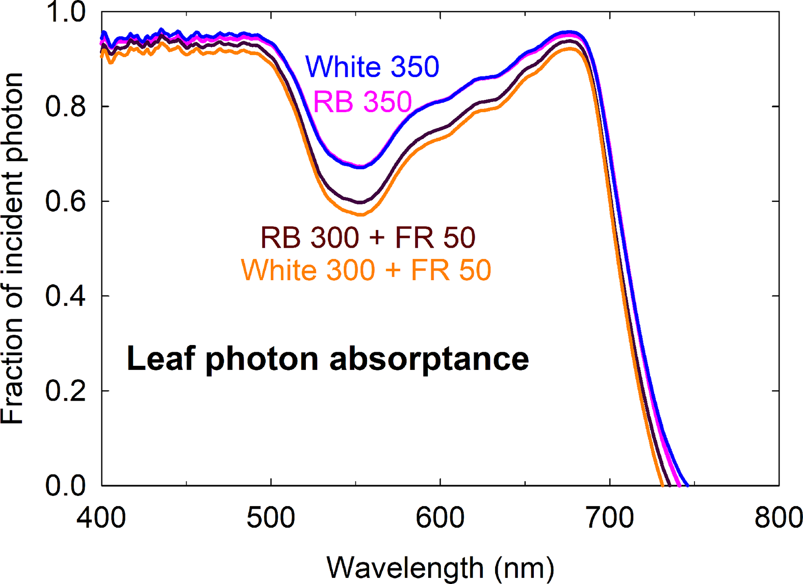 In addition, the far-red photons were less efficiently absorbed by the leaves, which reduced canopy photon capture (Table 1). As a result, the magnitude of increase in canopy photon capture in the FR substitution treatments was smaller than indicated by the fractional ground cover. Therefore, the use of total leaf area or canopy ground cover would likely lead to over-estimation of canopy photon capture.