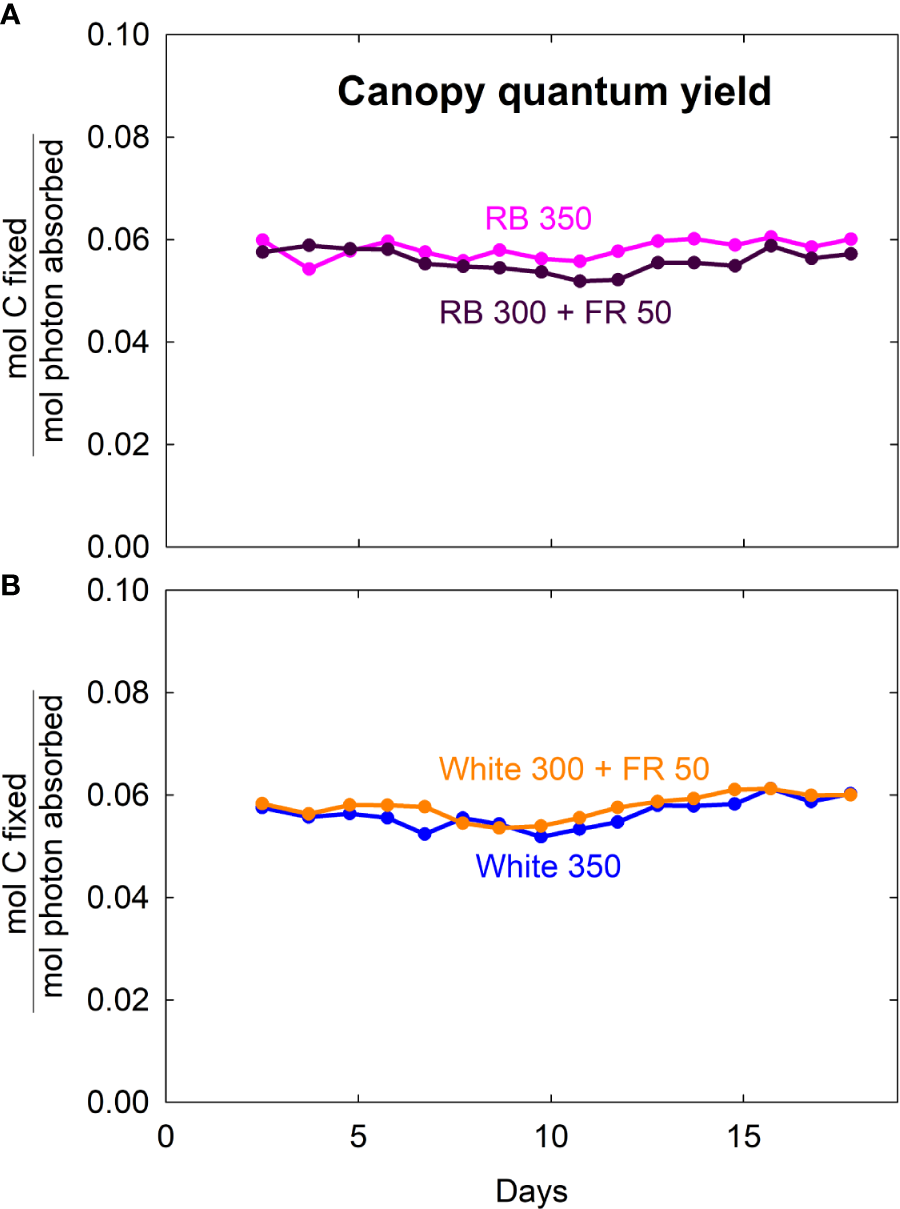Canopy quantum yield (moles of CO2 fixed in gross photosynthesis per mole of absorbed photons integrated over 400 to 750 nm) was similar among all four light treatments, with an average of 0.057 ± 0.002 (SD) (Figure 7). This indicates that the absorbed far-red photons were as efficient as red/blue and white photons.