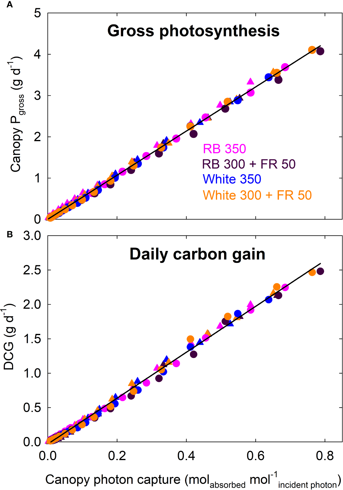 Canopy gross photosynthesis (Pgross) and daily carbon gain (DCG) as a function of canopy photon capture of lettuce. Canopy Pgross (and DCG) of all four treatments increased linearly with increasing photon capture and had a common slope. RB, red and blue; FR, far-red. The numbers following each type of light (e.g. RB 350) indicate photon flux density in μmol m−2 s−1. Circles represent data from Rep 1, and triangles represent data from Rep 2 (see DCG in Figure 3).