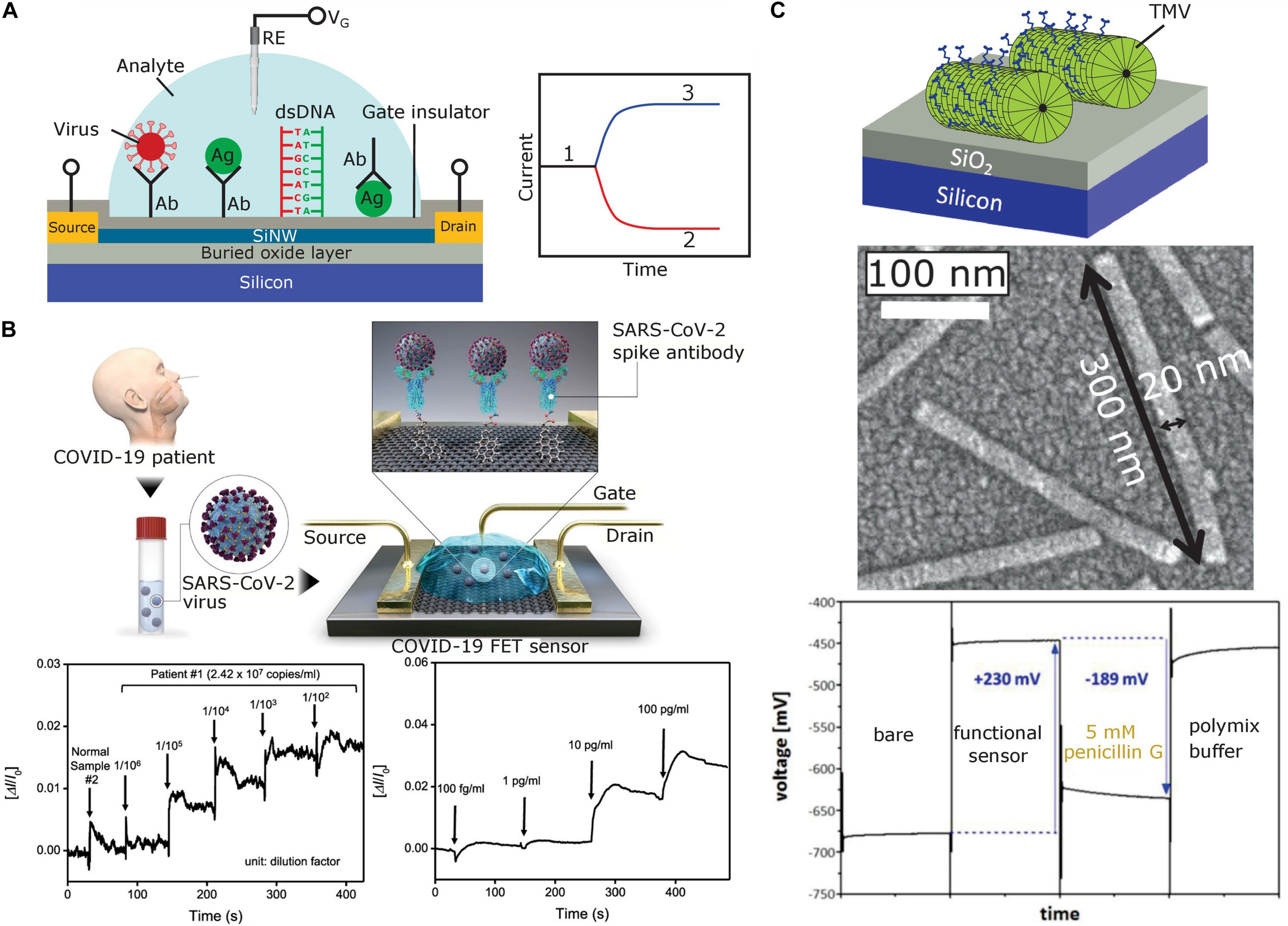 (A) Typical structure of a SiNW-FET prepared on a silicon-on-insulator wafer (left) and expected shift of original sensor signal (1) for a p-type SiNW-FET after binding of positively (2) or negatively charged (3) biomolecules (right). The SiNW-FET is composed of an active top thin Si layer covered with a gate insulator, source and drain electrodes, a thick buried SiO2 layer, and a bulk Si substrate. To selectively recognize target biomolecules or bioparticles, the gate insulator surface is functionalized with respective receptors (e.g., antibodies, antigens or ssDNA). (B) Schematic diagram of the COVID-19 FET sensor operation procedure (top), real-time response of COVID-19 FET toward SARS-CoV-2 cultured virus (bottom left), and SARS-CoV-2 antigen protein (bottom right). Adapted from Seo et al. (2020) with permission of the American Chemical Society. (C) Capacitive field-effect EIS sensor modified with TMV particles (top), scanning electron microscopy image of TMV particles on the sensor surface [middle, adapted from Poghossian et al. (2018) with permission from Elsevier], and constant-capacitance response of the EIS sensor [bottom, adapted from Koch et al. (2018a) with Creative Commons Attribution License]. Ab, antibody; Ag, antigen; RE, reference electrode; VG, gate voltage.