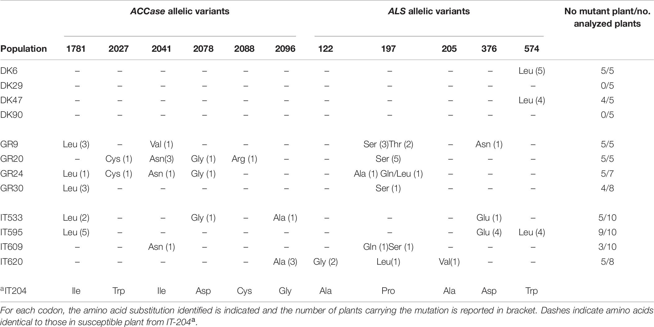 Table 7. ALS and ACCase allelic variants identified in resistant Lolium spp. plants from Danish, Greek, and Italian populations compared to the susceptible plant.