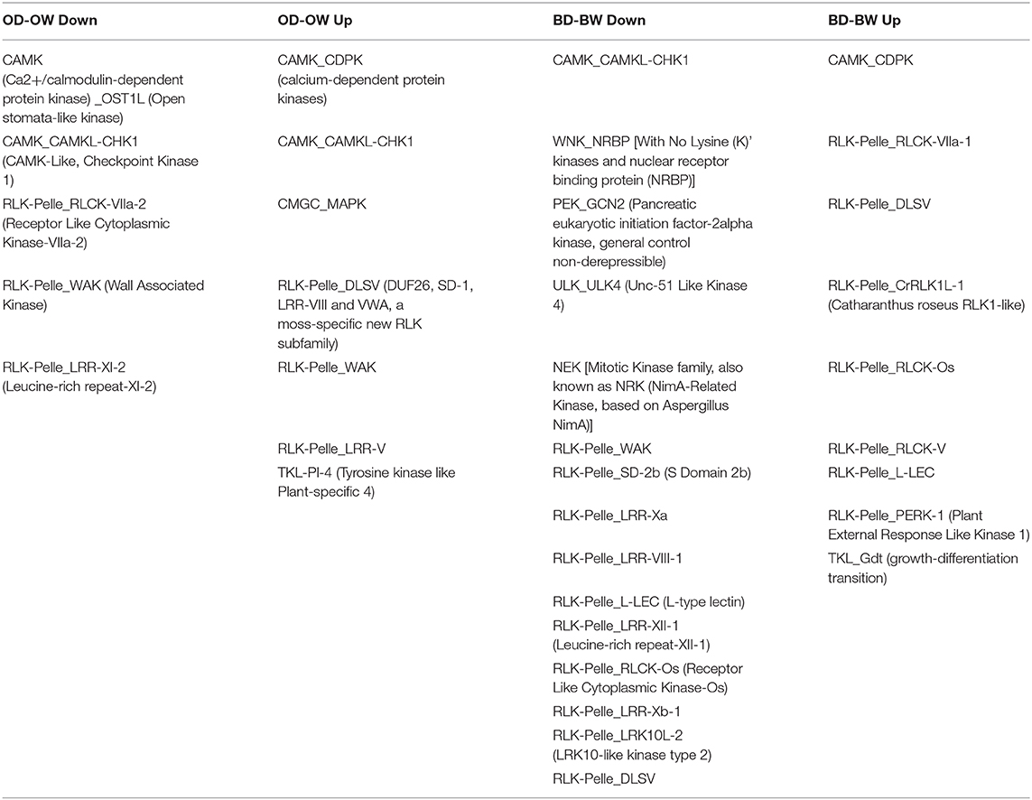 The DE kinases in the two genotypes are shown in Table 5; Supplementary Tables 10–13. In the down-regulated group of genes from Baronesse, the dominant family-subfamily was receptor like kinase-Pelle (RLK-Pelle). In this family/subfamily, 14 types of kinases were significantly down regulated more than 2-fold, including 10 RLK-Pelle-DLSV, 8 RLK-Pelle-WAK, 8 RLK-Pelle-L-LEC, and 7 RLK-Pelle-SD-2b. Baronesse also showed 7 RLK-Pelle genes up-regulated more than 2-fold. Otis showed 12 categories of kinases regulated under reduced water. For example, two Ca2+/calmodulin-dependent protein kinases (CAMK) (OST1L and CAMKL-CHK1) were significantly down-regulated while CAMK-CAMKL-CHK1 was uniquely up-regulated in Otis. In addition, two different categories of plant specific tyrosine kinase like (TLK) genes were significantly up regulated in the two genotypes under drought conditions.