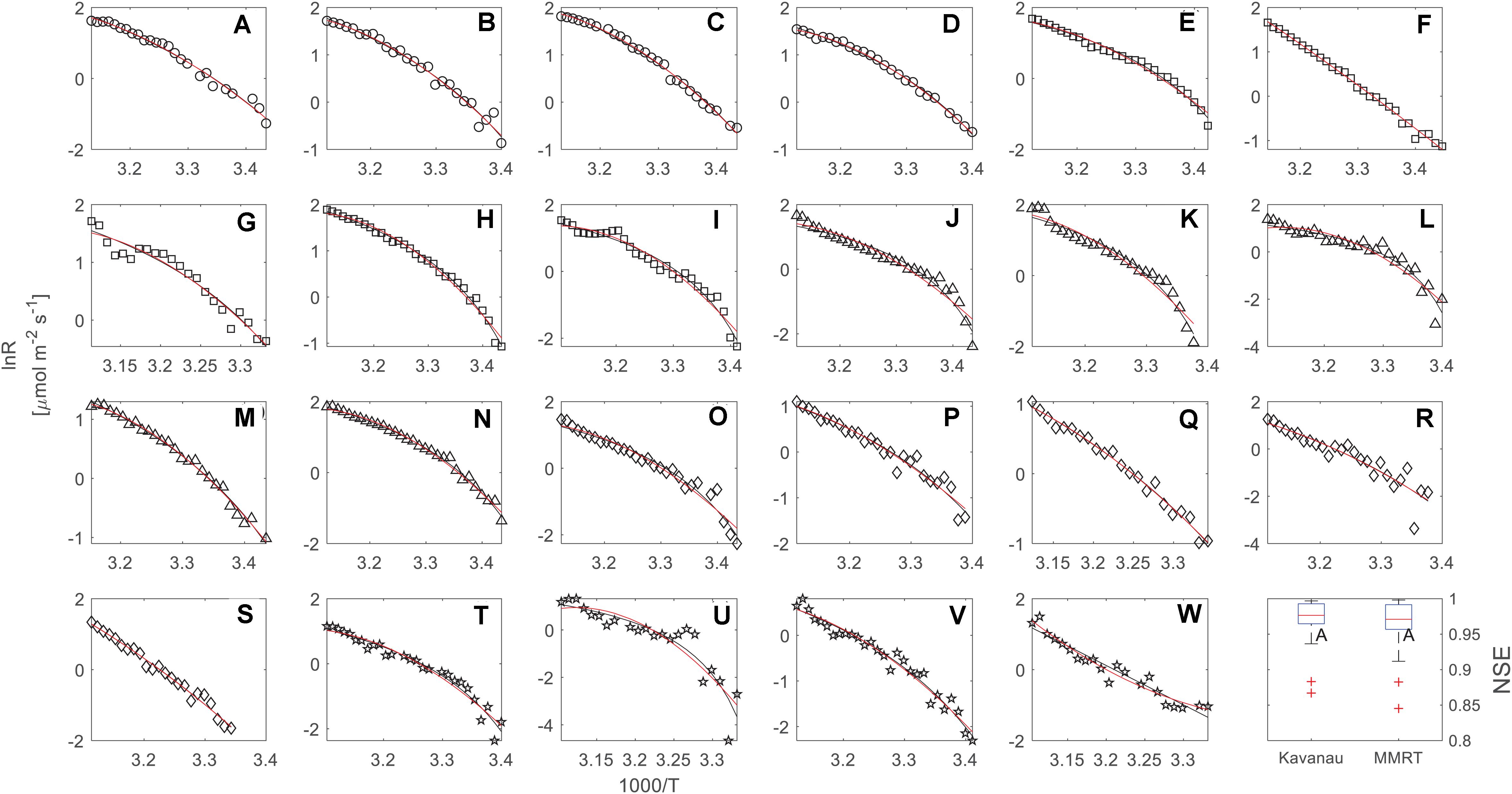 Figure 2. Temperature response measurements (black circles) of leaf respiration over five different urban tree species, including F. virens (circles, A–D), F. altissima (squares, E–I), M. alba (triangles, J–N), E. apiculatus (diamonds, O–S), and C. burmannii (pentagrams, T–W). Each curve (23 curves in total) was fitted by the Kavanau model (black line) and MMRT (red line). The last panel gives a comparison of Nash and Sutcliffe model efficiency (NSE) between the Kavanau model and MMRT for 23 the individual temperature response curves.