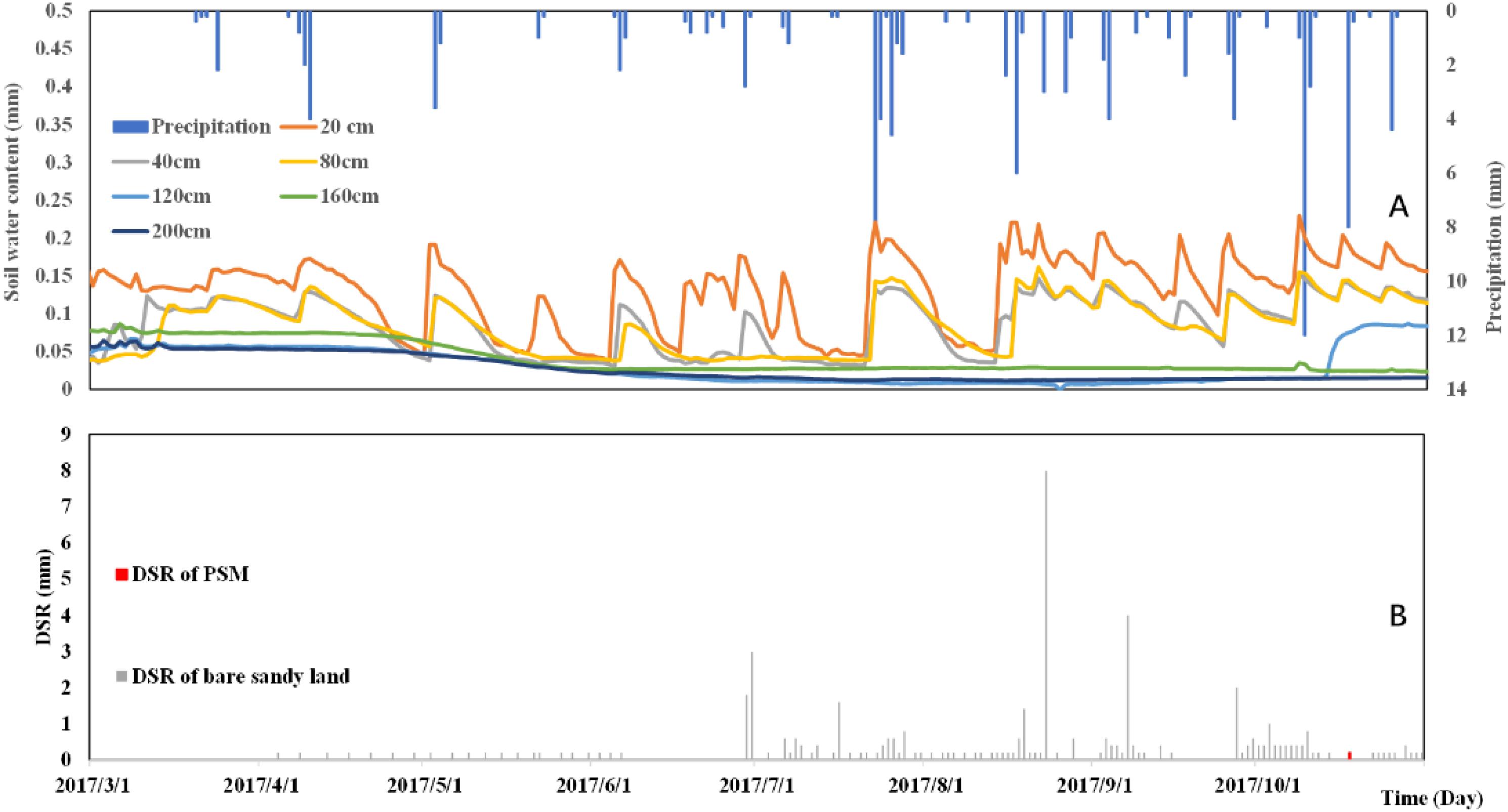 3. Due to the PSM, precipitation is intercepted by roots layer in the shallow soil, and the amount of DSR decreased from 273.6 mm in bare sand to 1 mm (wet year, 2016), and from 55.2 to 1.2 mm (dry year, 2018).