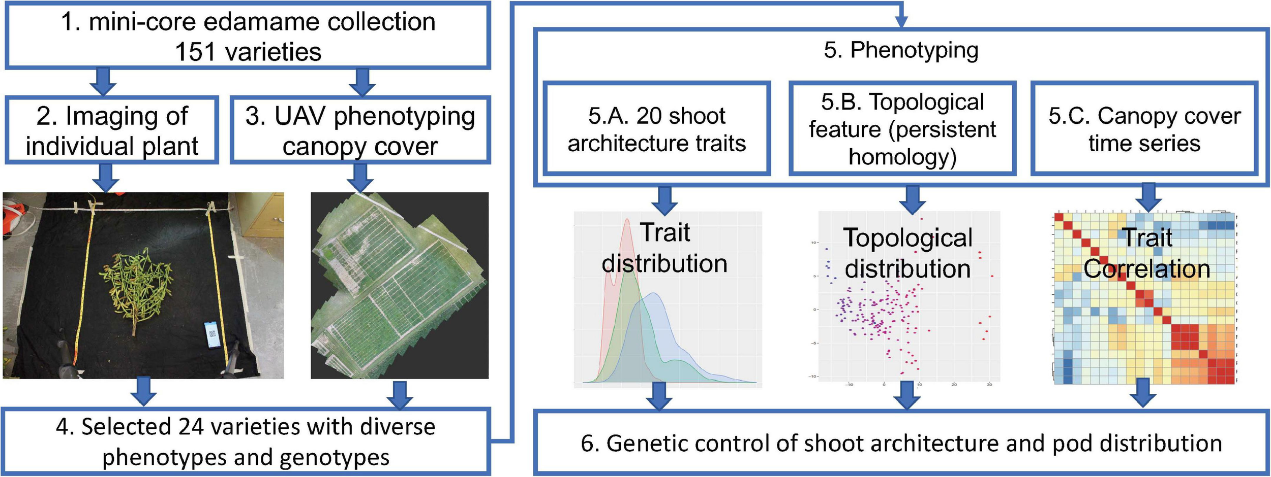 Workflow of phenomics analysis of edamame shoot architecture and canopy cover. Step 1. Data from a mini-core collection of edamame varieties were used for this study. Step 2. Individual plant was imaged twice on a black background. Step 3. Unmanned aerial vehicle was used to collect canopy cover data over the growth season. Step 4. Selected varieties were used for detailed characterization of the shoot architecture. Step 5. Phenotypic data analyses were performed. Step 6. Potential genetic control points of shoot architecture were analyzed.