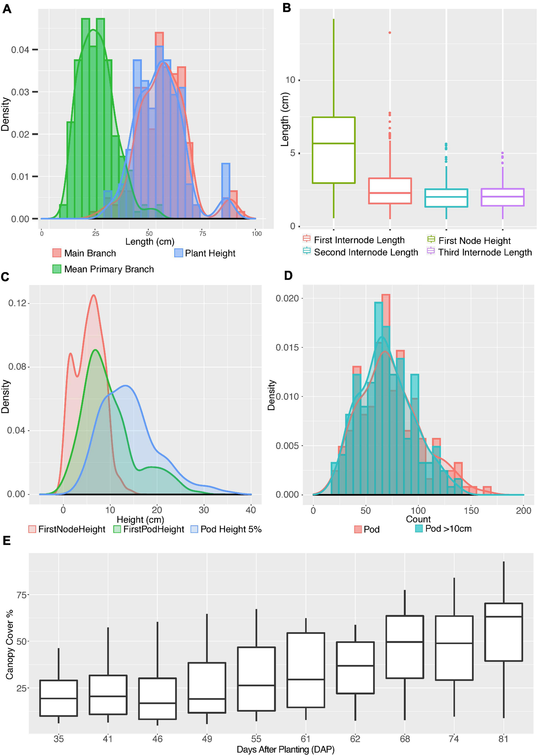 Distribution of shoot architecture parameters in edamame plants. (A) Histograms and density plots for main branch length, plant height and average primary branch length. (B) Boxplot shows the distribution of first pod height, first, second and third internode lengths. (C) Density plots compare first node height with first pod height and 5% pod height. (D) Histograms and density plots for number of pods per plant and number of pods above 10 cm from ground. (E) Boxplot of canopy cover changes in the growth season.