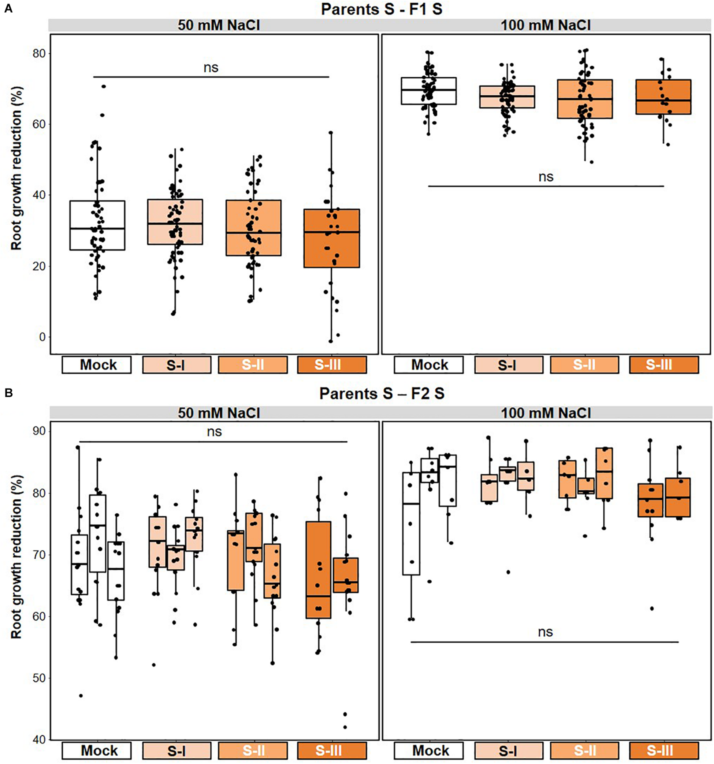 Lack of salt-mediated t-IR in matched environments. Parental plants had been exposed to different stress intensities by soil salinity (NaCl; Mock, S-I, S-II, and S-III). Salt tolerance of F1 and F2 plants was quantified by root growth reduction (%) over a 5-day period on NaCl-containing agar medium relative to the average root growth on agar medium without NaCl. Boxplots show the interquartile range (IQR; box) ± 1.5xIQR (whiskers), including median (horizontal line) and replication units (dots). (A) Unaltered tolerance of F1 plants to 50 and 100 mM NaCl. Data represent growth reduction percentages of single plants within F1 populations from similarly treated parents (n = 60). ns, no statistically significant differences (ANOVA; α = 0.05). Root growth data for individual F1 populations are shown in Supplementary Figure 4A; root tolerance data for individual F1 populations are shown in Supplementary Figure 4C. (B) Unaltered tolerance of F2 plants to 50 and 100 mM NaCl after one stress-free F1 generation. Data represent growth reduction percentages of single plants within F2 populations that share a common parental ancestor (n = 18–20). ns, no statistically significant differences (ANOVA; α = 0.05). Root growth data for individual F2 populations are shown in Supplementary Figure 4B; root tolerance data for individual F2 populations are shown in Supplementary Figure 4D.