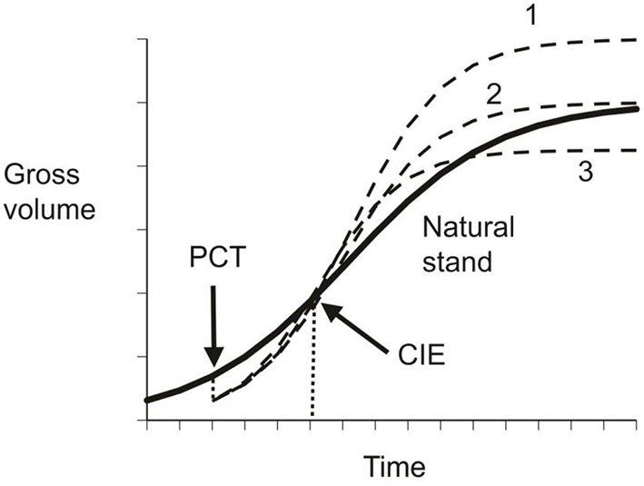 Schematic illustration of compensatory growth. The solid line represents gross volume in natural stands, the dished lines indicates possible compensatory outcomes under different precommercial thinning regimes: 1 – over-compensation; 2 – exact compensation; and 3 – under-compensation.