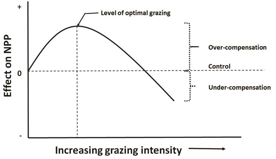 Herbivore-optimization curve (redrawn from McNaughton, 1983) showing level of optimal grazing occurs in mid grazing intensity, which can be defined as number of herbivores, their biomass, or the amount of tissue removed.