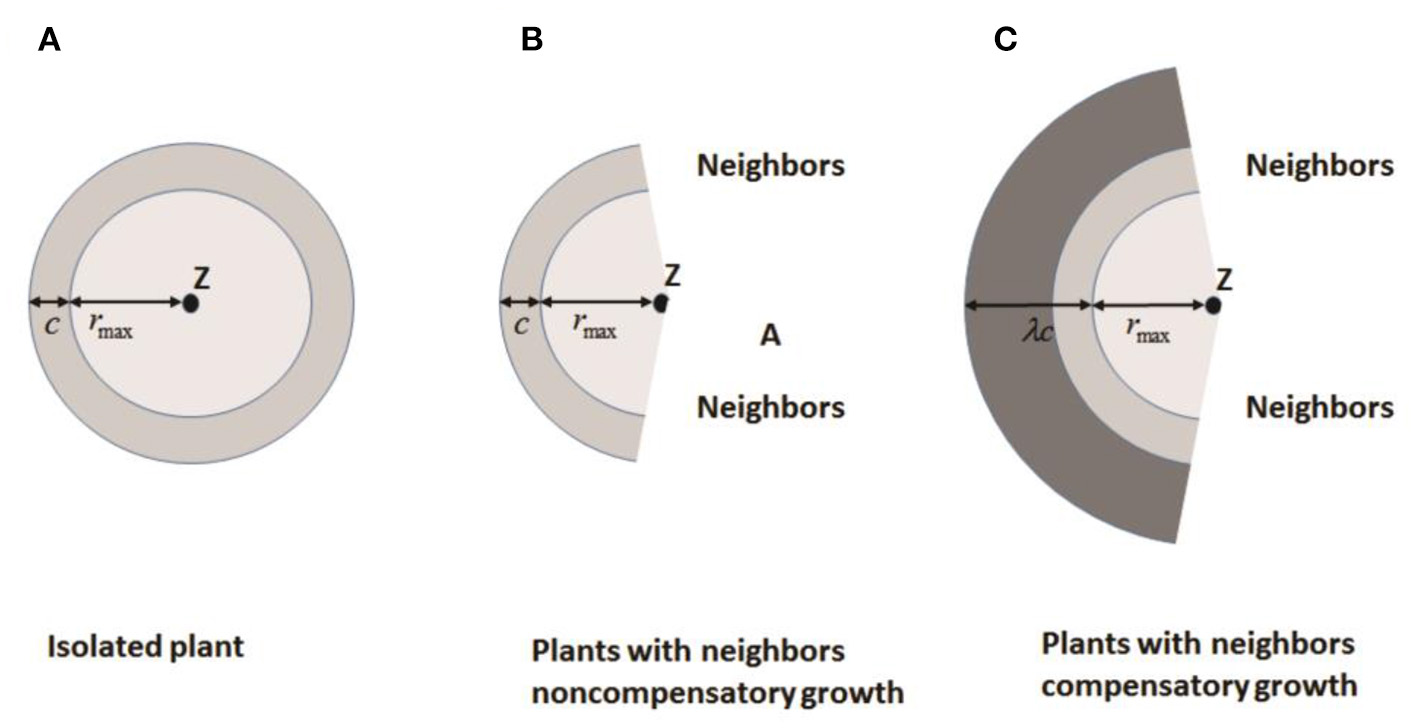 Bella (1971) defined the area of influence (AOI) as the circular area around a plant where it is effectively able to acquire resources. A “neighborhood” is generally defined as the circular area around a plant that contains all neighbors that affect its performance. The overlap in AOI of neighboring plants is used to estimate competitive pressure. Both AOI and neighborhood are based on a circle of fixed radius centered on a plant, which means that two plants in close proximity are always strong competitors. However, there is evidence that this is not always the case. Roots of many plants preferentially grow into areas of high resource concentration or into areas with less competition to compensate for close neighbors. Based on these findings, Brisson and Reynolds (1997) proposed a simple heuristic “compensatory” model of neighborhood interactions to explain such patterns. Assuming that the overlap of AOI between neighbors is minimal, the growth of individuals is symmetric (circular) until neighboring root systems meet (Figure 3A) where c is the radial increment of a circular plant in absence of a neighbor. When neighboring plants exist, the asymmetric growth of non-compensatory growth will stop at the edges of neighboring plants as shown in Figure 3B, representing loss from competition. For compensatory growth, asymmetric growth occurs in areas free of neighbors to compensate for the “loss of resources” in the zone of interaction by a single parameter λ as illustrated in Figure 3C. Therefore, non-compensatory growth is a special case of compensatory growth when λ = 1. With the increasing λ, the compensatory growth becomes stronger.