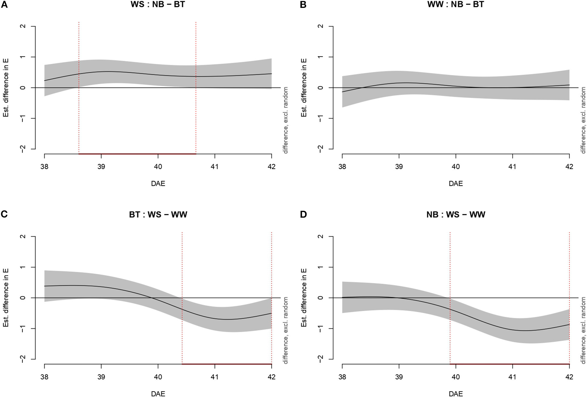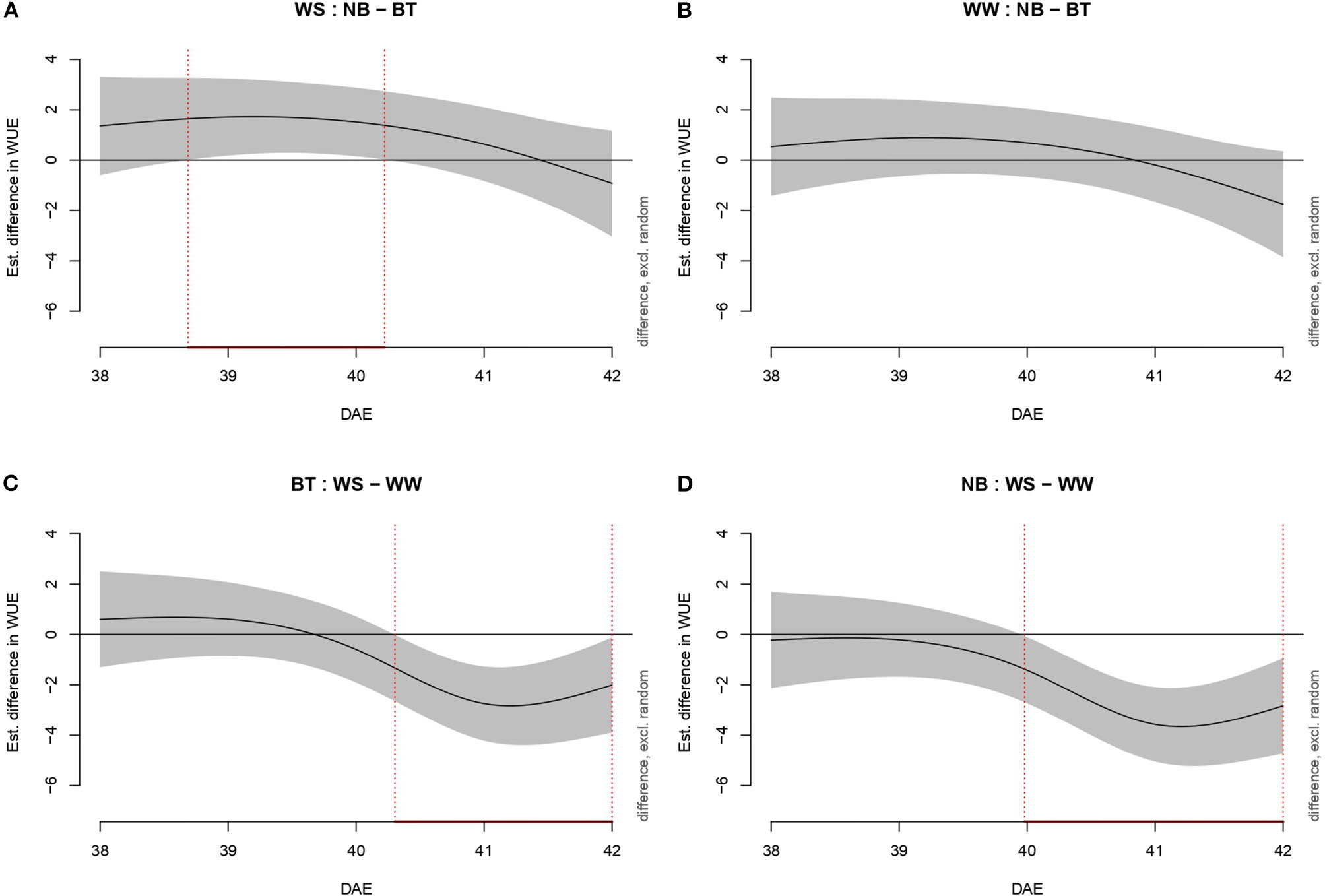 Figure 4. Graphs showing differences in water-use efficiency (WUE) among all combination of treatments (irrigation and biostimulant). Random effects are excluded. The baseline above is represented by untreated plants, below by watered (control) plants. The pointwise 95% CI is shown by a shaded band. When the shaded confidence band does not overlap with the x-axis (i.e., the value is significantly different from zero), this is indicated by a red line on the x-axis (and vertical dotted lines). (A) WS, comparison between NB and BT. (B) WW, comparison between NB and BT. (C) BT, comparison between WS and WW. (D) NB, comparison between WS and WW.