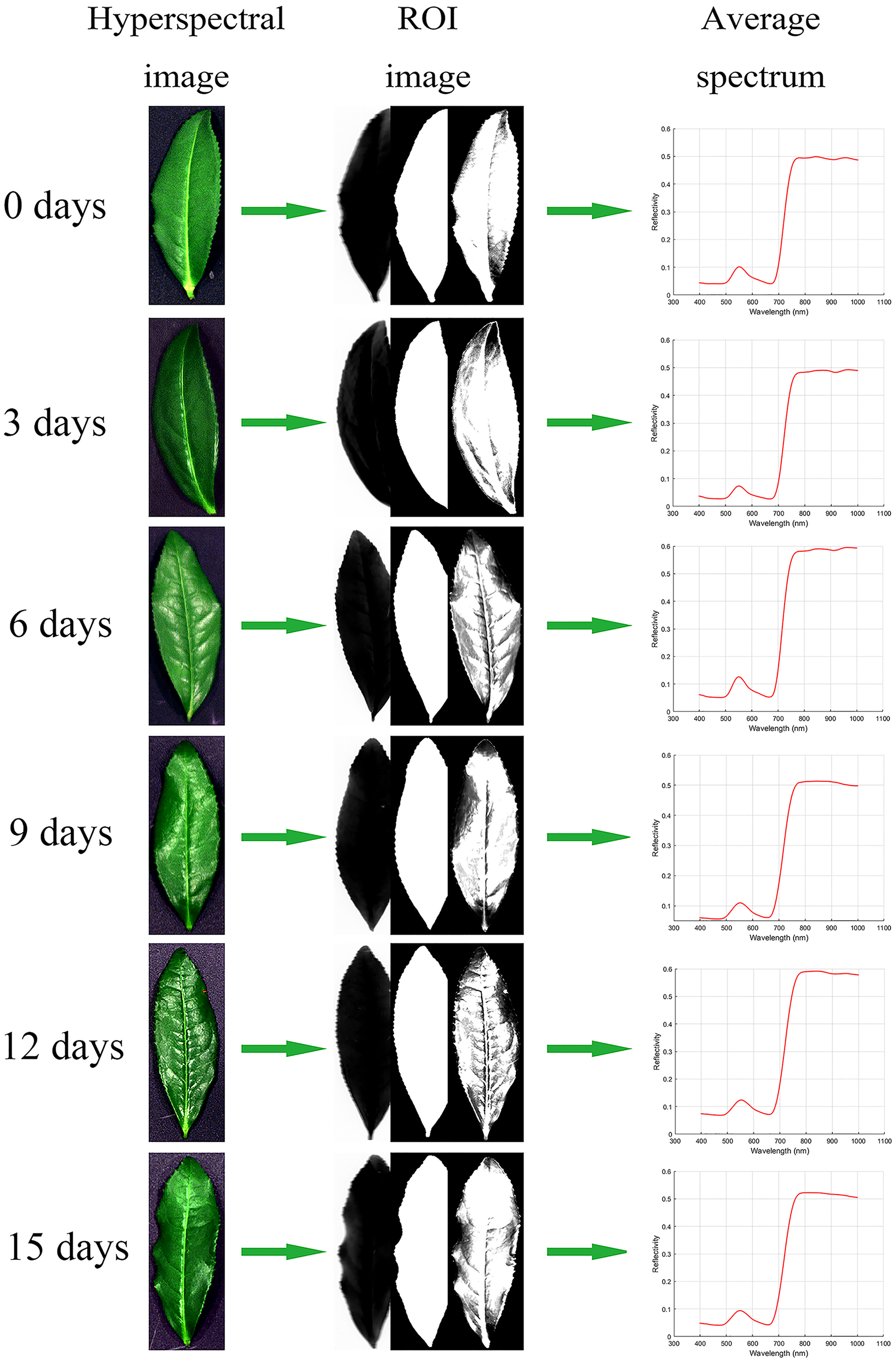Hyperspectral image processing flow of tea leaves: Hyperspectral image, ROI image (band math, segmentation image, masking), and average spectrum.