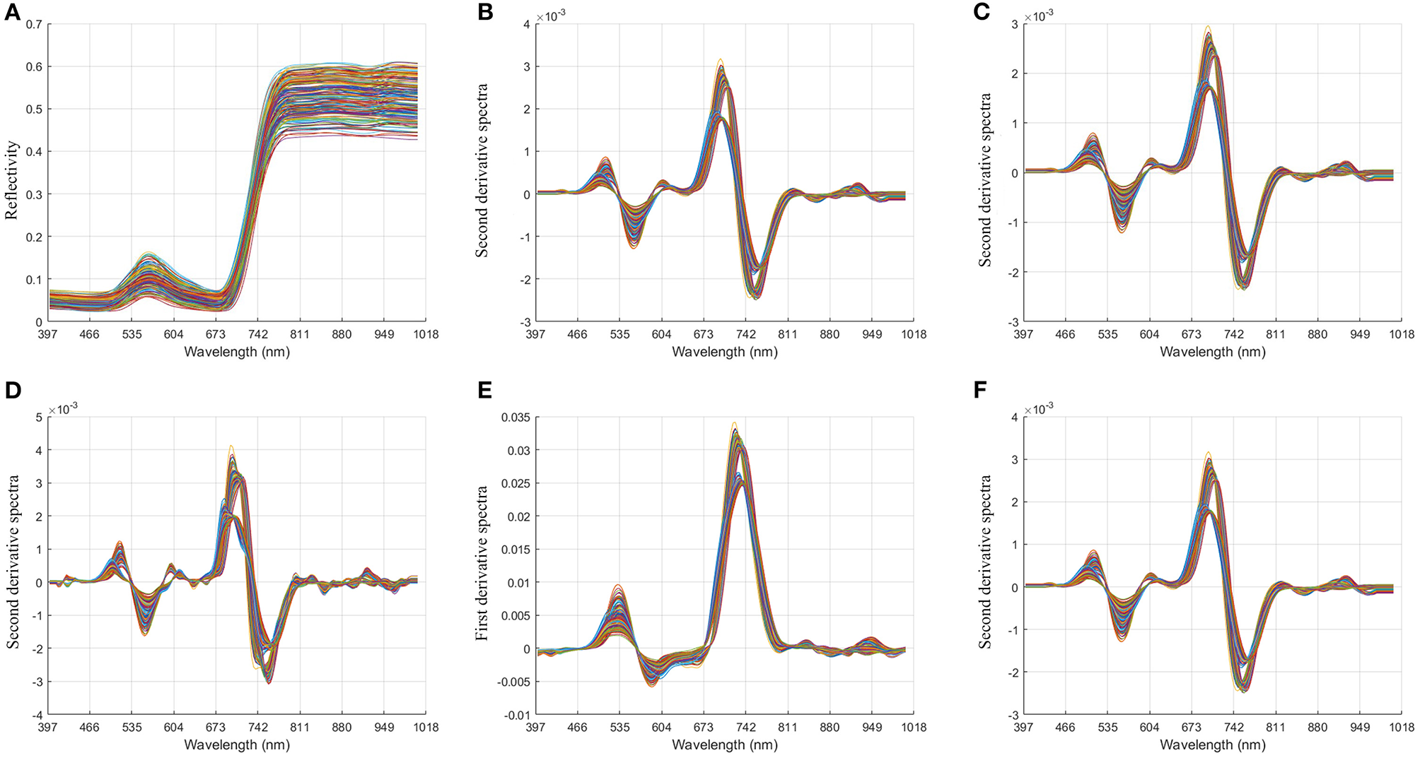 Image comparison of unprocessed spectral data and preprocessed spectral data. (A) Original spectral data; (B). multiplicative scatter correction + second derivative + Savitzky-Golay (17); (C). multiplicative scatter correction + second derivative + Savitzky-Golay (19); (D). multiplicative scatter correction+ second derivative + Savitzky-Golay (7); (E). multiplicative scatter correction + first derivative + Savitzky-Golay (5); (F). multiplicative scatter correction+ second derivative + Savitzky-Golay (17).