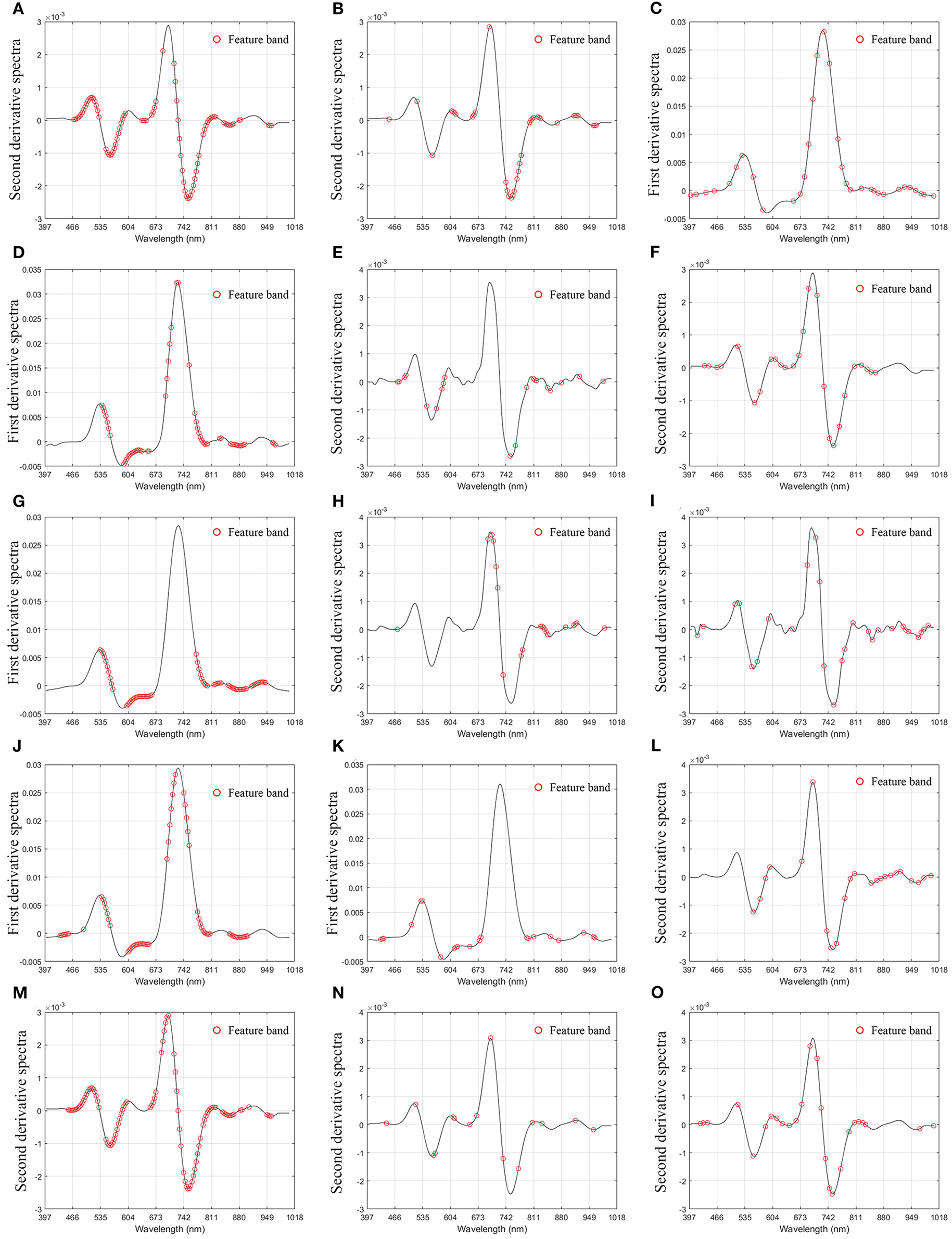In order to reduce the influence of the external environment and the dark current of the spectrometer, and reduce the baseline drift, light scattering, and other noises of the spectrum, we preprocessed the spectrum. In this paper, MSC, derivative (1D, 2D), and S-G technology are used to preprocess hyperspectral data (Tian et al., 2005; Zhao et al., 2005; Lu et al., 2019b). The spectral differences caused by different scattering levels are eliminated, and the correlation between spectra and data is enhanced. It can be seen from Figure 4 that, through pretreatment, it is found that the peak valley of the spectral bands is obvious, avoiding the interference of overlapping peaks and improving the resolution and sensitivity of the spectrum.