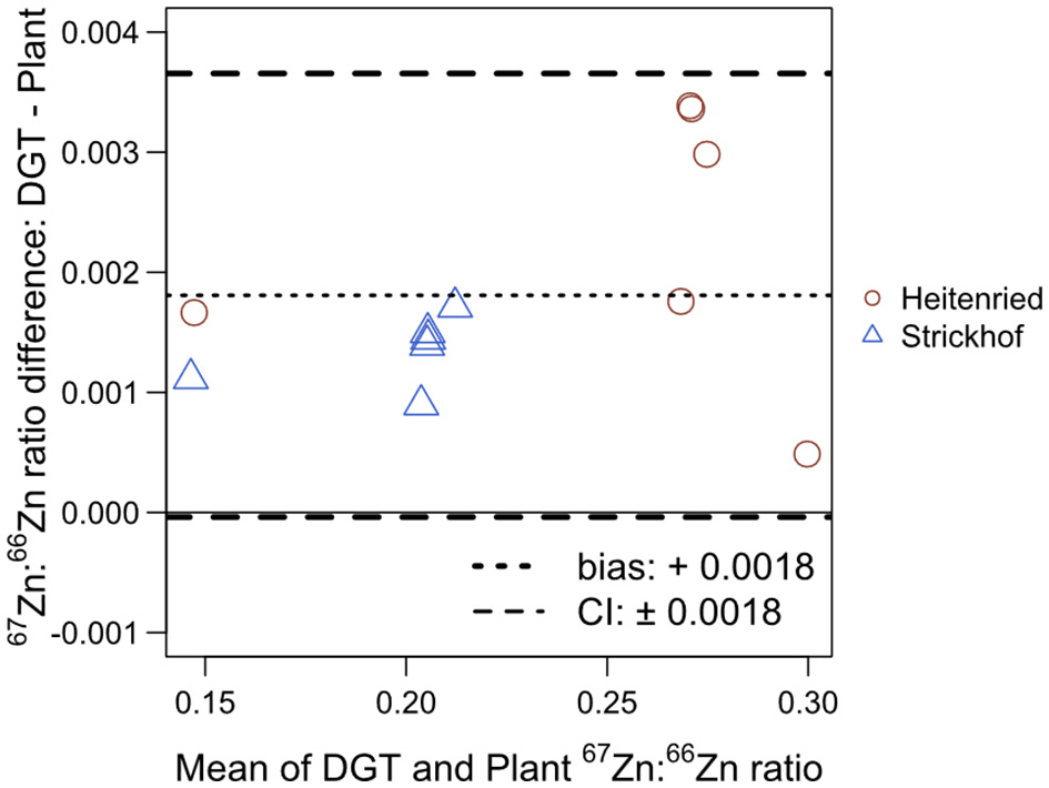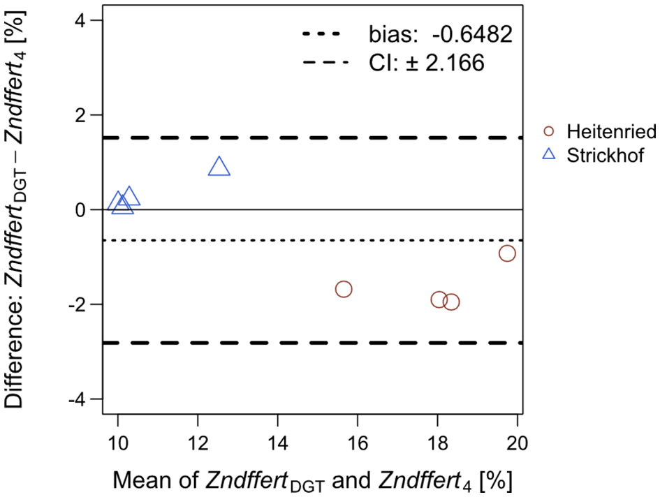 Data were processed using R 3.6.3 statistical software. Identification of significant differences among treatments in the plant growth trial was performed with analysis of variance (ANOVA) and Tukey's honest significant difference post hoc multiple comparison. Two-way ANOVA was performed to test the significance of soil effects, fertilizer effects, and their interaction in the plant growth trial. The Bland–Altman approach was used to compare the Zn recovery calculated with stable isotope technique and the AUE method and, to compare the 67Zn:66Zn isotope ratios, and also the proportion of Zn derived from the fertilizers, measured with the DGT extracts and the plants. This approach allows agreements or discrepancies between two analytical methods to be assessed by illustrating the bias and 95% confidence interval of the absolute difference between the values obtained by the two methods (Bland and Altman, 1986).
