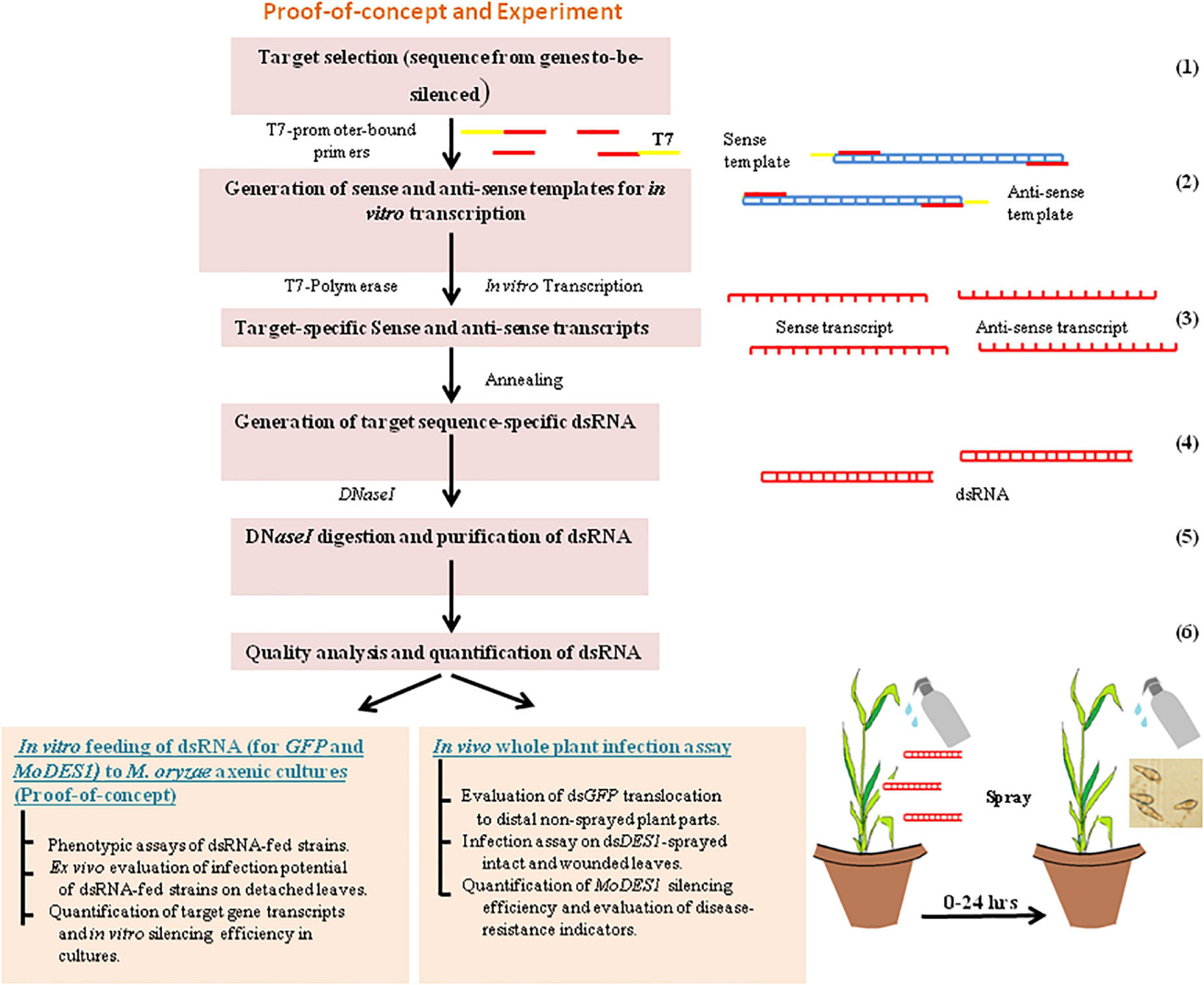Schematic flow of work. Schematic flow diagram for in vitro synthesis of dsRNA, and proof-of-concept representing its in vitro feeding into Magnaporthe oryzae axenic cultures, in vivo spray-application on rice plant, and infection assay. Numbers on the right hand side indicate the steps involved in the process.