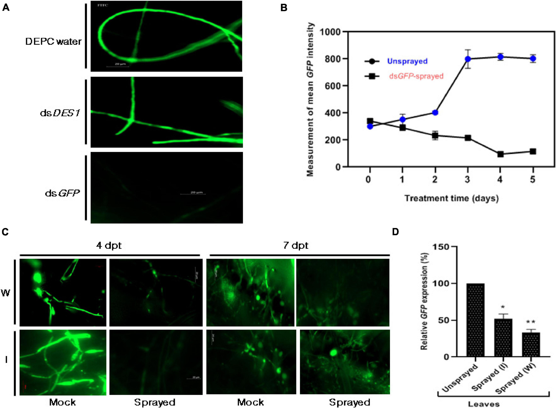Effect of dsGFP on M. oryzae GFP.(A) Microscopic assessment of GFP intensity 3 dpt, among axenic cultures of M. oryzae GFP fed with and without dsGFP. While the culture that was not fed with any dsRNA (DEPC water- treated) was kept as the negative control, the culture that was fed with dsDES1 (non-specific for GFP) served as the positive control. (B) Time-dependent fluorescence trend of M. oryzaeGFP grown on 300 nM dsGFP-sprayed leaves with respect to the unsprayed set, across 0–5 days. (C) Fluorescence of M. oryzaeGFP on wounded (W) and intact (I) rice leaves sprayed with dsGFP, 24 h prior to infection. GFP fluorescence was observed under an FITC filter of AxioCam mRm 0 [4 h post treatment (hpt)], 4, and 7 dpt, and fluorescence emitted by M. oryzaeGFP on Tris EDTA (TE)-sprayed leaves were kept as mock. TE was sprayed 24 h prior to infection, as replacement for dsGFP. Comparisons were made between the sets, at similar time points, with observations made from at least 10 leaves for each set. The experiment was repeated thrice, and the results were compared independently. (D) Relative abundance of GFP transcripts in dsRNA-sprayed wounded and intact leaves, with respect to TE-sprayed leaves, at 4 dpt. OsACTIN was used as internal control for normalization. The experiments were repeated thrice, each time with three biological replicates. Error bars represent standard deviation (n = 3), where * and ** denote statistical significance at the P ≤ 0.05 and P ≤ 0.01 levels, respectively.