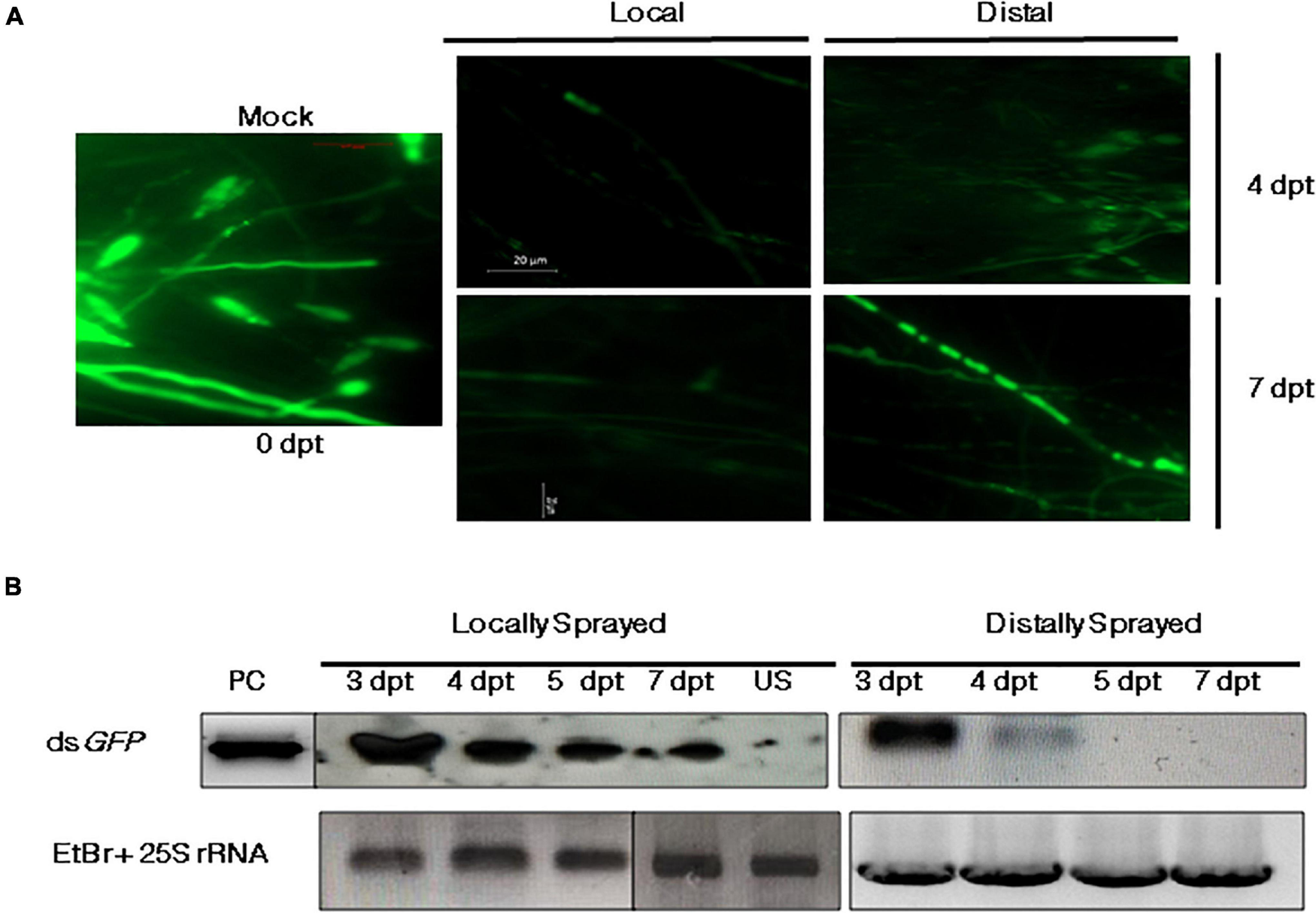 Systemic silencing activity of dsRNA and its accumulation in the local (sprayed) and distal (unsprayed) leaves. (A) Fluorescence microscopy of wounded M. oryzaeGFP-inoculated leaves that were either sprayed with either TE (mock) or dsGFP in local and distal regions. Mean fluorescence intensity of GFP from approximately five plants (10 lesions) of each set was monitored 4 and 7 dpt. (B) Northern blot profile for GFP-specific dsRNA. The longevity and accumulation of RNA signals were assessed 3, 4, 5, and 7 dpt on locally and distally sprayed leaves. The total RNA isolated from unsprayed (US) leaves was run as negative control. In vitro-synthesized and purified dsGFP was used as the positive control (PC), and rice 25S rRNA was kept as the loading control. Sense GFP probe with the same sequence as the parent dsGFP and PCR-purified rice 25S rRNA (primers listed in Supplementary Table 2) were used for hybridization.