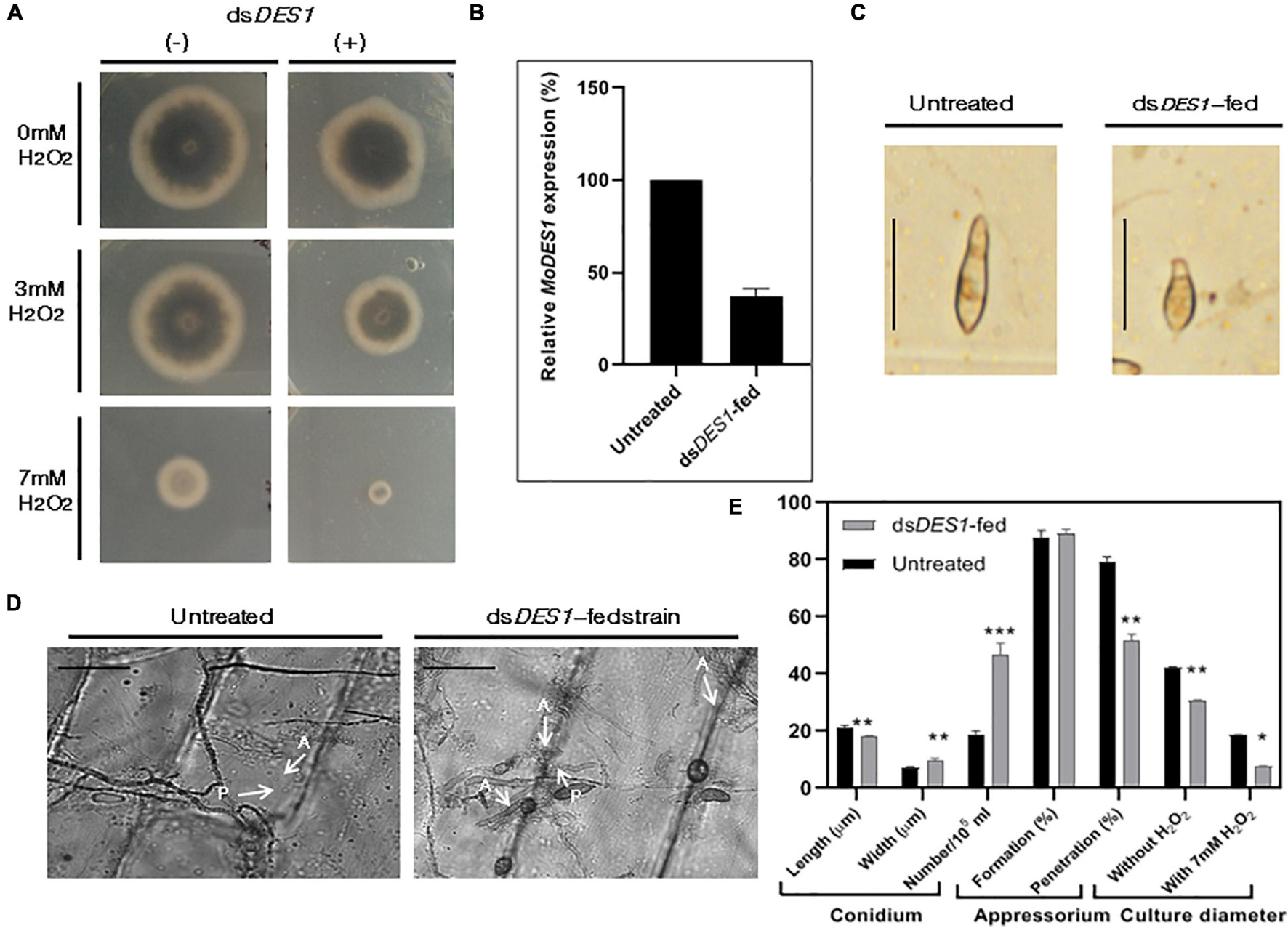 Assessment of ROS-scavenging activity, morphological traits, and target transcripts in the in vitro dsDES1- fed strain. (A) Reactive oxygen species (ROS) sensitivity assay of dsDES1-fed and untreated strains of wild-type B157. The dsDES1-fed and dsDES1-untreated strains were grown on CM plates with 0, 3, and 7 mM H2O2, and average growth diameter of the cultures was recorded from 5- to 10-day-old plates in triplicates. The experiment was repeated twice. (B) Relative MoDES1 expression in the dsDES1-fed strain with respect to the untreated strain 72 hpt. The reactions were set up in triplicates, and MoACTIN was used as internal control. (C) The dominant morphological deformity in a major fraction of conidia isolated from the dsDES1-fed strain. For size reference, a 20-μm scale has been used. (D) Penetration potential of germinated appressoria among the untreated and dsDES1-fed strain, on onion epidermal peel. A 50-μm scale has been used for size- reference. Three replicates were used, and at least 50 conidia were assessed in each category. (E) Comparison of phenotypic parameters between untreated and dsDES1-fed strain. Error bars represent standard deviation, and *, **, *** denote statistical significance at the P ≤ 0.05, P ≤ 0.01, and P ≤ 0.001 level, respectively.