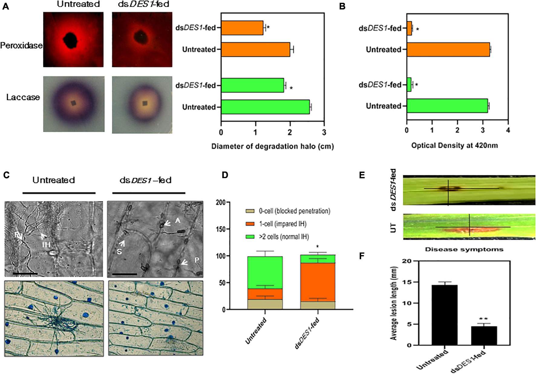 Extracellular enzyme activity and virulence potential of dsDES1-fed strain. (A) The extracellular laccase and peroxidase activity of the in vitro-dsDES1-fed strain on CM plates supplemented with ABTS and Congo red (CR), respectively. The average diameter of halo or discoloration indicator of substrate breakdown was measured in triplicates from 5-day-old plates. (B) Activities of laccases (green) and peroxidases (orange) in culture filtrates of the untreated and dsDES1-fed strain. (C) The upper panel indicates the 40 × -magnified differential interference contrast (DIC) image of onion peel infected with untreated and dsDES1-fed strain. The white arrows indicate the spore, S; appressoria, A; point of penetration, P; invasive hyphal, (IH) growth. The lower panel shows a 10 × -magnified bright field image of Lactophenol blue-stained fungal infection units grown on onion epidermal cells. This is indicative of the cell-to-cell movement of IH and host colonization. (D) Graphical representation of the fraction of infection units that showed differential ease of host-colonization, beyond the primary site of penetration. The potential for cell-to-cell movement of IH was color-coded based on the number of cells they penetrated (0– > 2). At least 50 different infection units were observed for each set, and the experiment was repeated thrice. (E,F) Spot inoculation of detached rice leaves with spores isolated from the in vitro dsDES1-fed strain and untreated wild-type strain. Average length of lesion was measured for each set with approximately 50 leaves (≈ 100 lesions). The error bars represent ± SD, and * and ** denote statistical significance at the P ≤ 0.05 and P ≤ 0.01 levels.