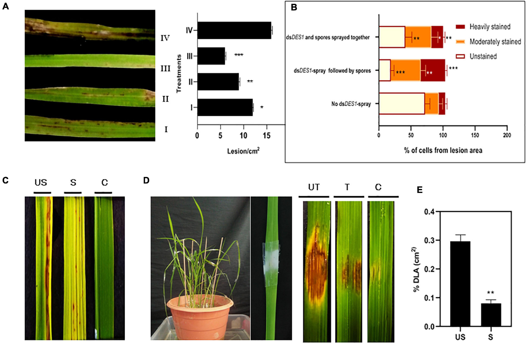 In vivo infection assay of dsDES1-sprayed plants. (A) The left panel shows spray-infected rice leaves that were sandpaper-abraded (to reduce the mechanical barrier) and sprayed with 300 nM dsDES1 (III) 24 h prior, (II) 12 h prior, or (I) 0 h prior (spores and dsDES1 were mixed together before spraying) to fungal inoculation. The unsprayed but fungus-inoculated set (IV) was used as control. The right panel indicates the relative infection severity for each treatment based on lesions/cm2. (B) DAB staining of lesions isolated from treatment sets I, III, and IV, representative of counter-infection host-derived ROS generation assay. The level of ROS generation was color-coded, and the fraction of cells representing each color was categorized. (C) Spray infection assay of dsDES1-sprayed (S) and unsprayed (US) leaves. Leaves that were neither dsRNA-sprayed nor spore-inoculated, were used as control (C). (D) Punch inoculation-mediated infection assay for dsDES1 drop-treated (24 h prior) rice leaves. Leaves that were simply punched and inoculated with Tween 20-Gelatin mixture without spores or dsDES1 were kept as control. (E) Disease severity in dsDES1-sprayed and unsprayed leaves expressed in terms of% diseased leaf Area (DLA). For infection related experiments, observations were performed on at least 50 leaves, and% DLA was assessed using the Image J software. Error bars represent standard deviation (n = 50); where *, **, and *** denote statistical significance (Student’s t-test) at the P ≤ 0.05, P ≤ 0.01, and P ≤ 0.001 levels, respectively.