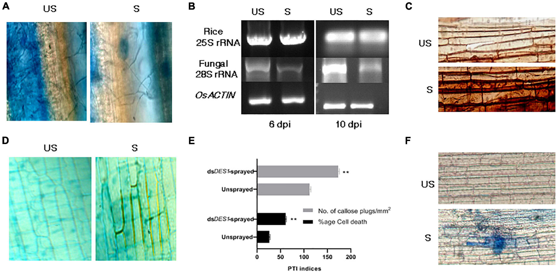 Evaluation of fungal growth and defense parameters of pathogen-associated molecular pattern (PAMP)-triggered immunity (PTI). (A) Qualitative assessment of fungal growth. Lactophenol blue staining of fungal mycelia observed in infection lesions from dsDES1-sprayed and unsprayed leaves. (B) Semi-quantitative reverse transcriptase PCR for Mo28S rRNA that is representative of fungal biomass in sprayed and unsprayed infected leaves. While Os25S rRNA was the growth control from rice that was used for comparison, MoACTIN served as the internal control. (C) DAB assay. Host-derived ROS generation in infected cells from dsDES1-sprayed and unsprayed leaf-sheaths was visualized by DAB staining. (D) Secondary wall deposition around primary infected cells and their neighbors to curb disease progression via aniline blue staining. (E) Callose plug formation (aniline blue staining) and percentage of cell death (trypan blue staining) in dsDES1-sprayed and unsprayed infected rice cells. (F) Trypan blue staining of sprayed and unsprayed sheath cells undergoing necrosis. The error bars represent standard deviation, and ** denotes statistical significance at the P ≤ 0.01 level.