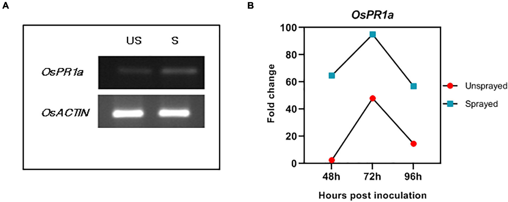 Expression of OsPR1a. (A) Semi-quantitative Reverse transcriptase PCR for rice defense- related PR1a in dsDES1-sprayed and unsprayed plants 72 hpi. (B) The relative fold change for OsPR1a expression in sprayed and unsprayed plants 48, 72, and 96 hpi, normalized against the house-keeping control OsACTIN. The reactions were set up in triplicates.