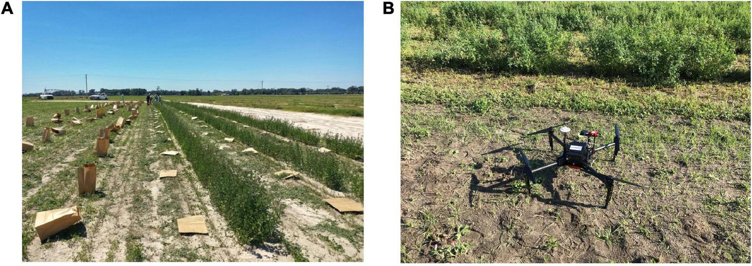 Phenotyping alfalfa for: (A) ground-based herbage accumulation (HA); and (B) High-throughput phenotyping (HTP) using an unmanned aerial vehicle (Matrice 100) with multispectral camera (MicaSense RedEdge, Seattle, WA, United States) taking off in the experimental area.