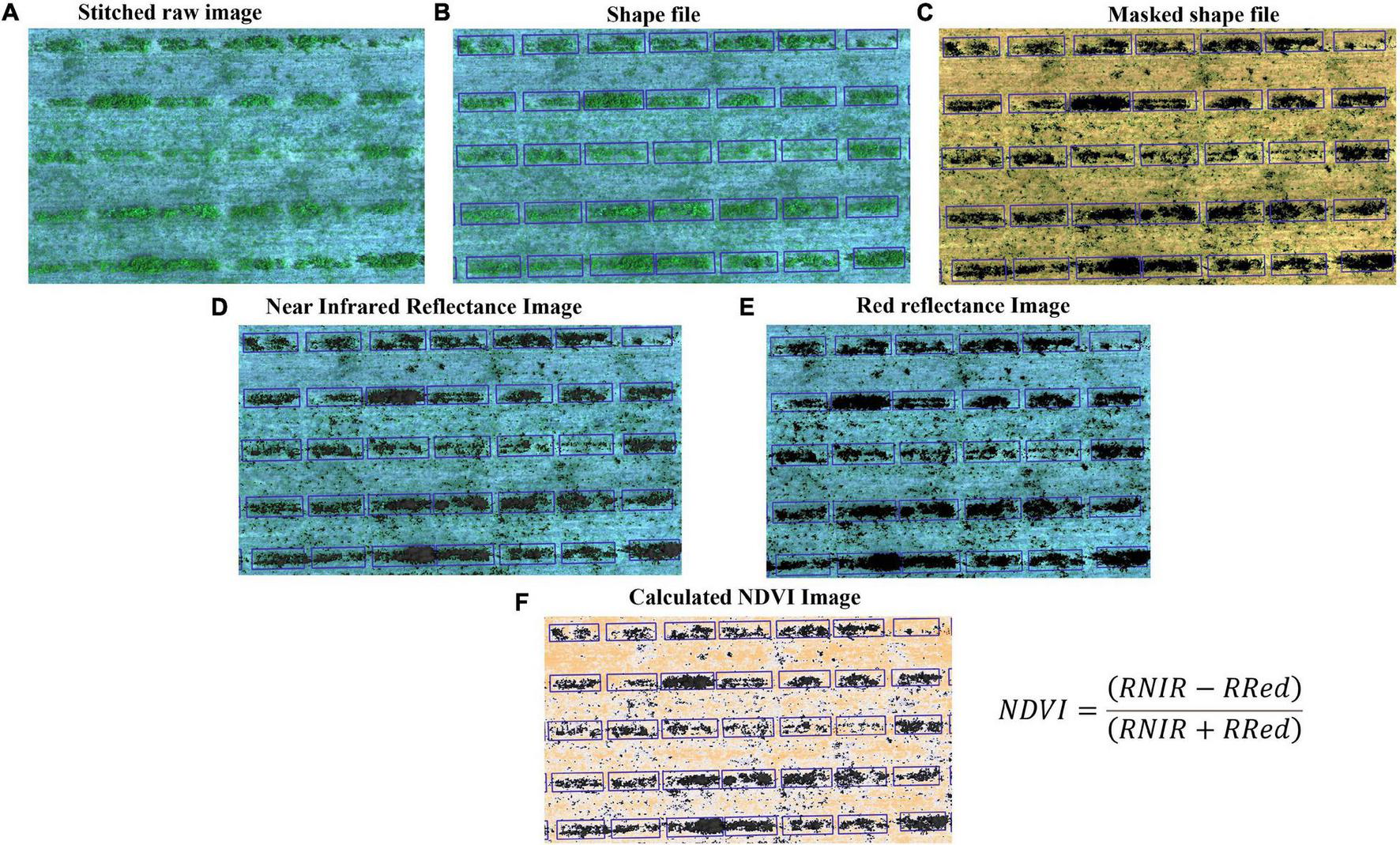 Workflow of image processing and data acquisition for the HTP. (A) Stitched raw images (each row is visible) from multispectral camera, (B) Shape file: each plot is separated by grid line, (C) Masked shapefile: canopy and bare ground places are noticeable, and these images are used to generate vegetation indices, (D) Reflectance image of infrared band, (E) Reflectance image of red band, and (F) Calculated NDVI image using panels (D,E).