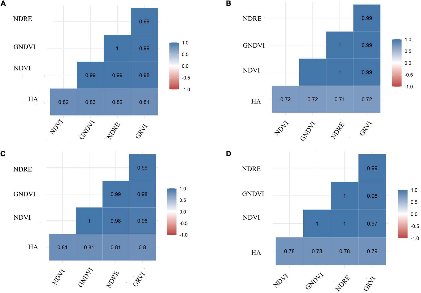 Pearson correlation coefficients between ground-based phenotyping for herbage accumulation (HA—kg ha– 1) and four vegetation indices (VIs): NDVI, normalized difference vegetation index; GNDVI, green normalized difference vegetation index; NDRE, normalized difference red edge; GRVI, green and red ratio vegetation index. Harvests: (A) harvest one, (B) harvest two, (C) harvest three, and (D) harvest four.