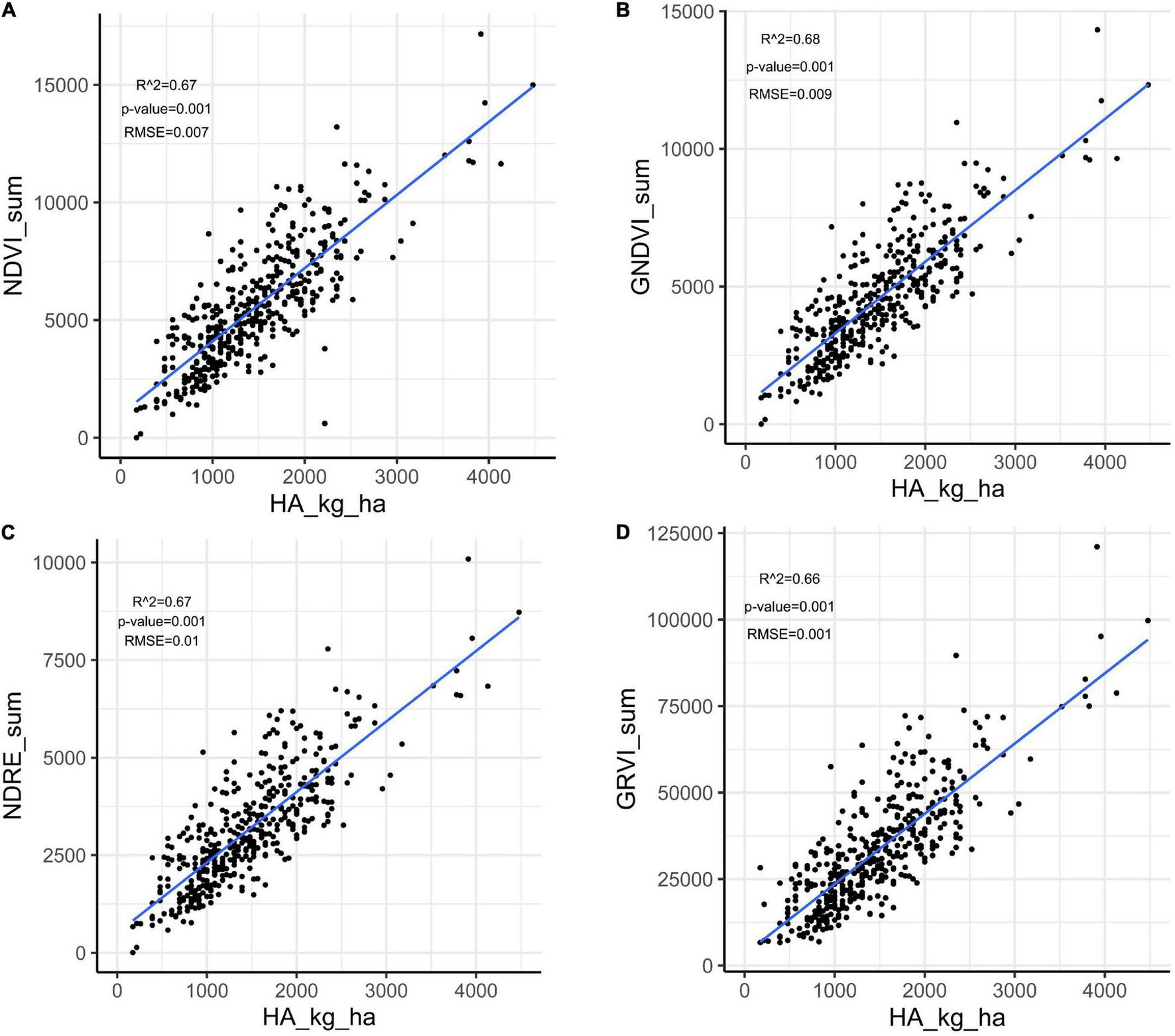 We utilized boxplots to assess all VIs and HA distributions across each harvest (Supplementary Figure 1). We estimated Pearson correlations between HA and VIs-sum (an integrative indicator of VIs) in R (R Core Team, 2020) to assess prospective best-fitting relationships between HA and VIs. Finally, we used ordinary linear mixed models to model HA using VIs-sum for each harvest (R Core Team, 2020).