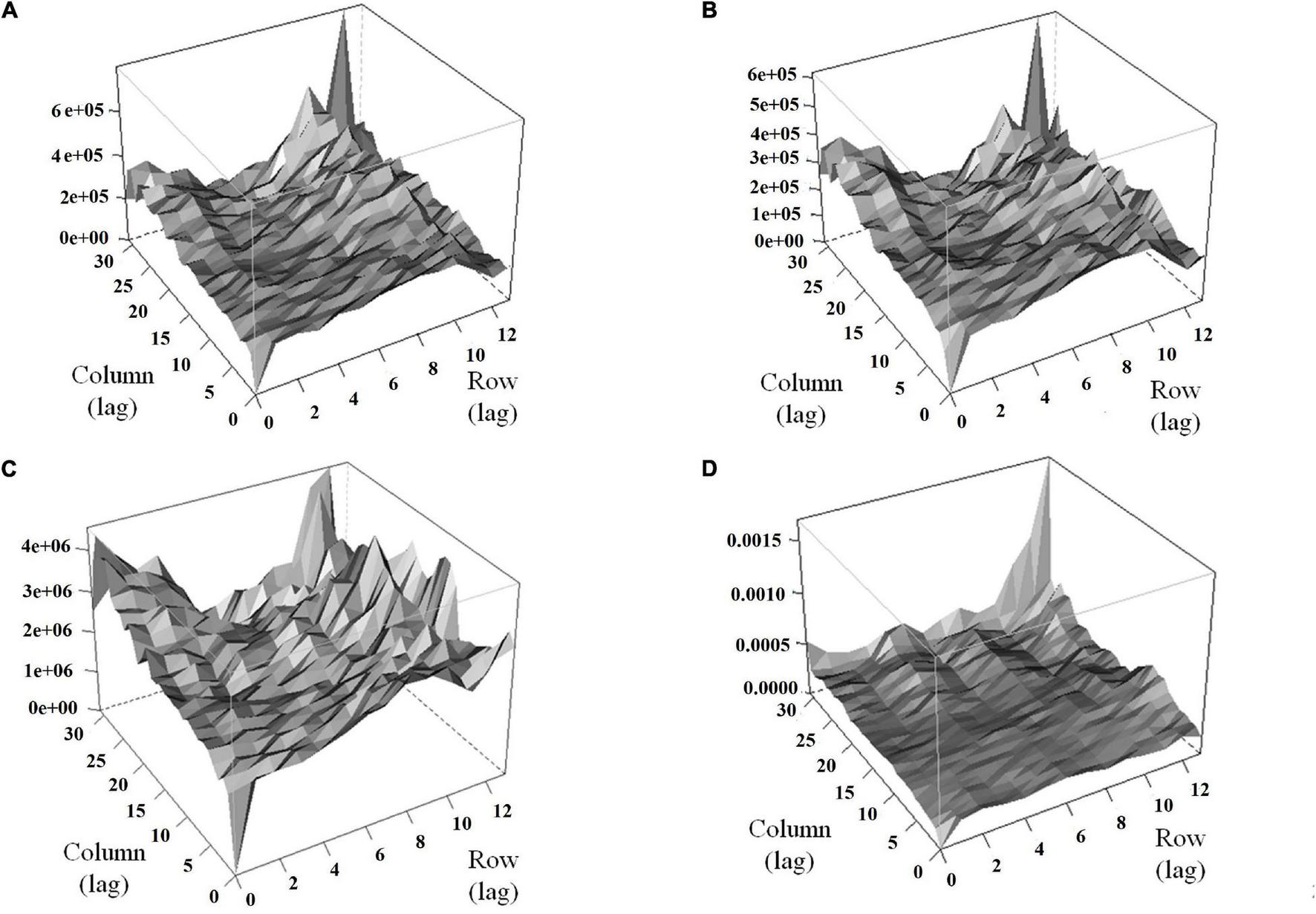 Variograms for HA and normalized difference vegetation index (NDVI) before (A,C) and after (B,D) the inclusion of terms to control local and global trends for alfalfa yield in harvest one in alfalfa families evaluated in Citra, FL. (A) HA-based model, (B) HA-spatial model, (C) NDVI-based model, (D) NDVI-spatial model. Row and column are coordinates for the rows and columns in the experimental area, respectively.