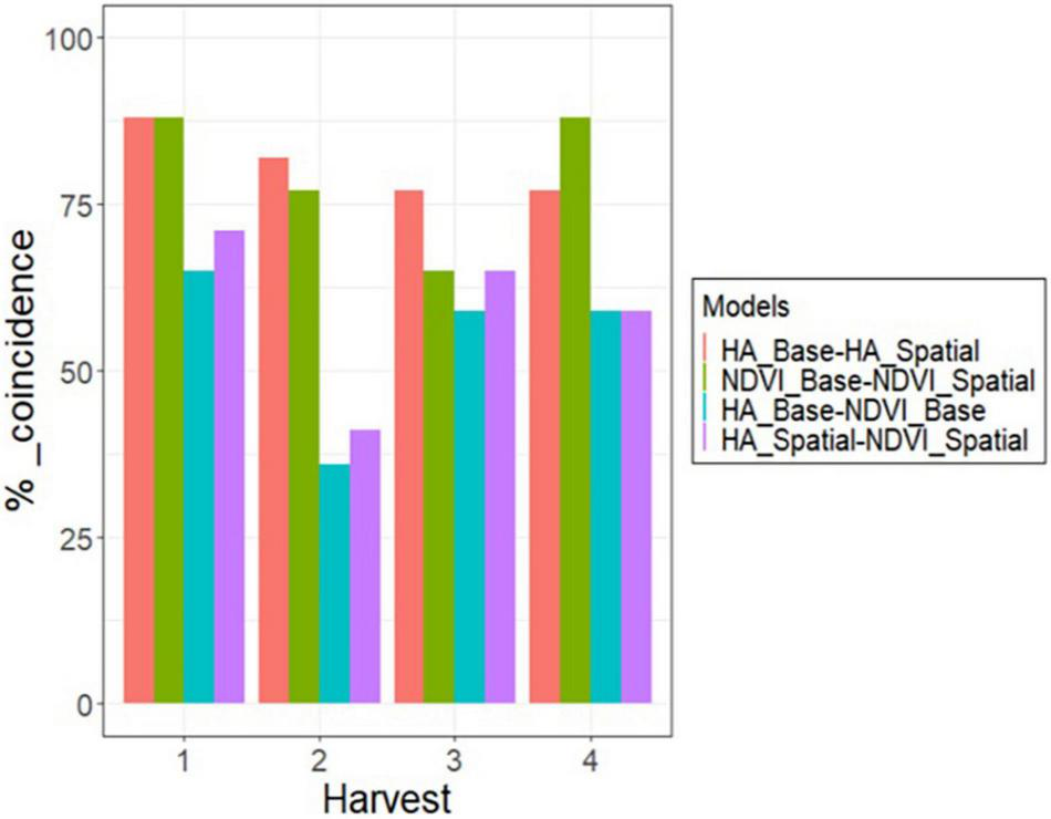 Percent of coincidence in selection for the 10% best alfalfa families between HA and NDVI, using the base and spatial model, across four harvests in alfalfa families evaluated in Citra, FL, United States.