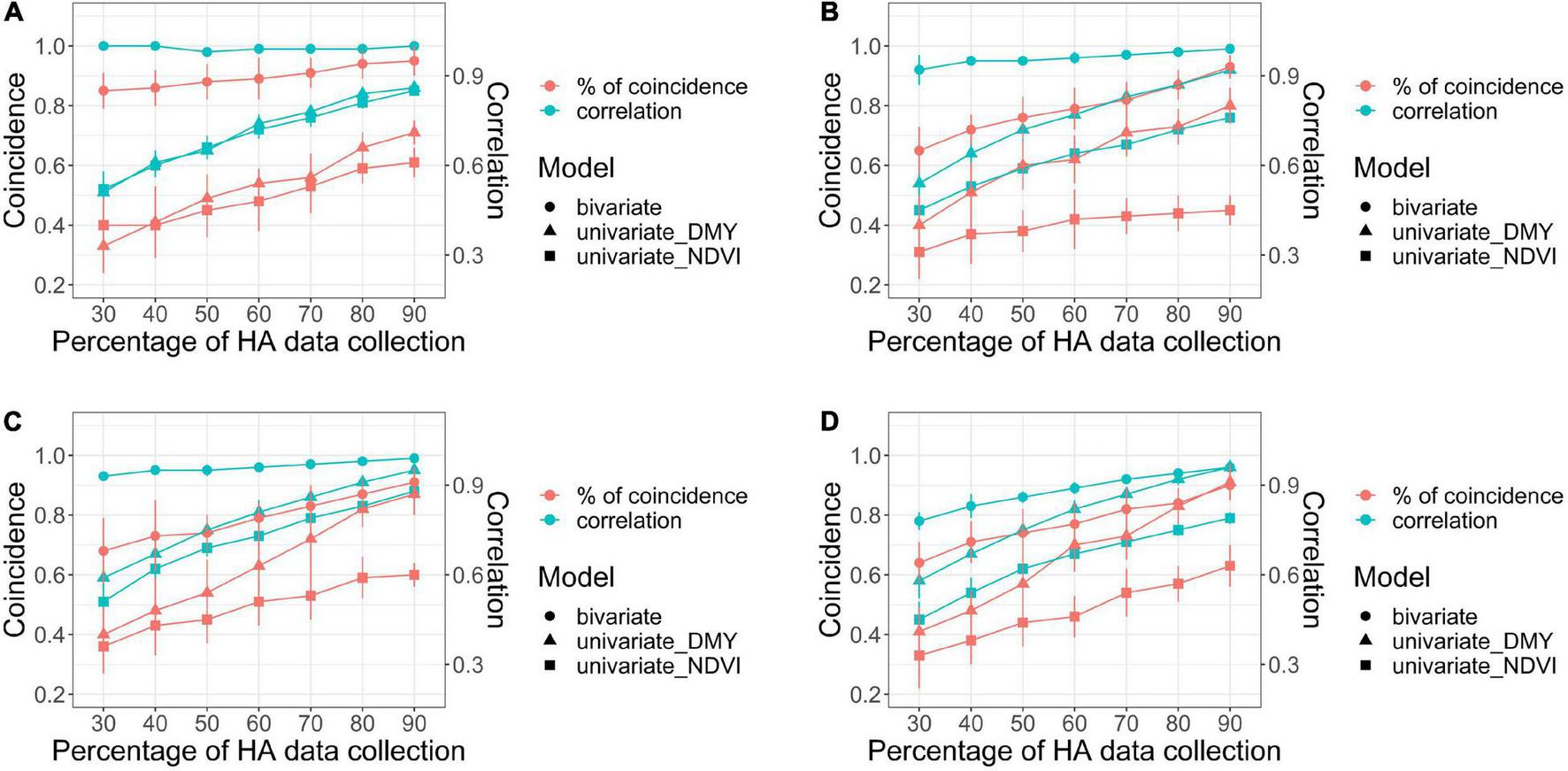 We compared the full bivariate and univariate models utilizing HA, NDVI with the different scenarios using the following calculations: (i) coincidence of selection (%) after applying a 10% selection intensity and (ii) the correlation among predicted values across all families.