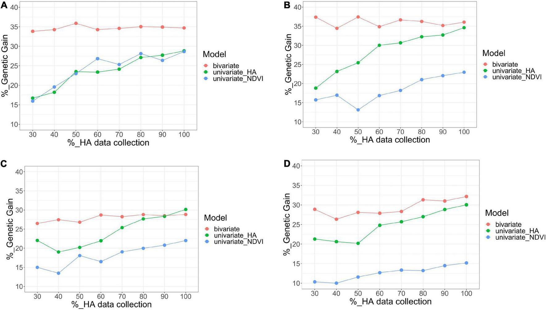 Comparison of bivariate model (HA and NDVI, red), and univariate (HA, green; NDVI, blue) models for genetic gain for HA, after applying a 10% selection intensity for scenarios with increasing levels of HA data collection (30–100%) across four harvests in alfalfa families evaluated in Citra, FL, United States. Harvests one (A), two (B), three (C), and four (D).