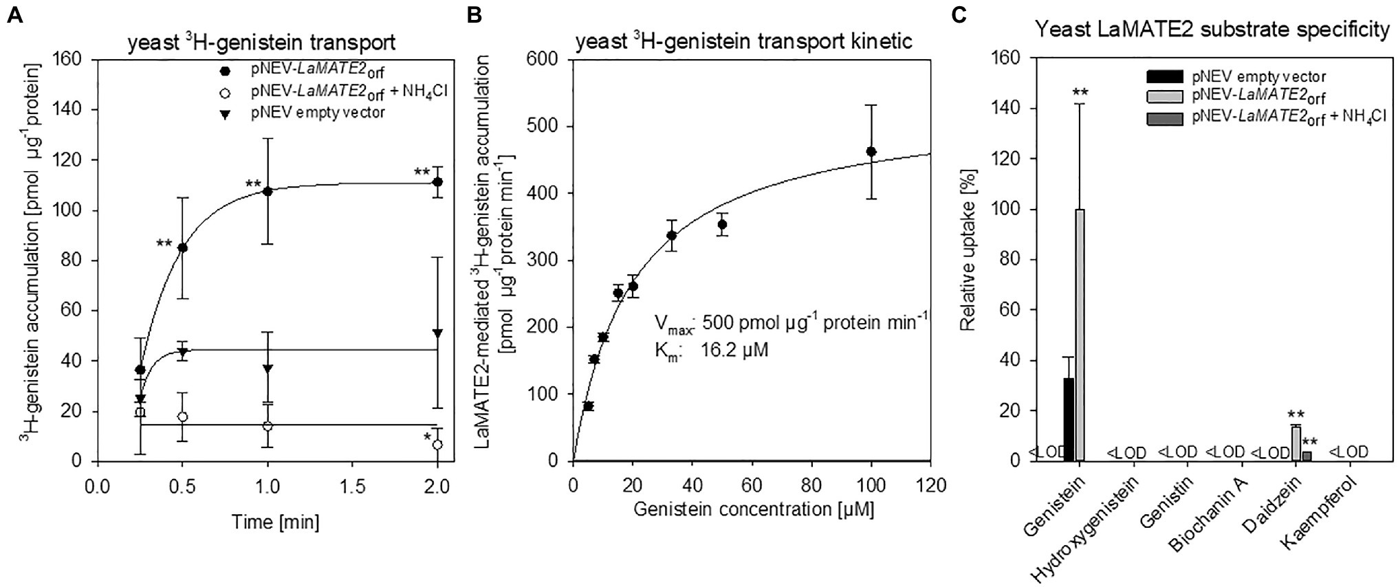 Figure 7. Transport of phenylpropanoid compounds mediated by LaMATE2. LaMATE2-mediated transport rate of phenylpropanoids in yeast microsomal membrane vesicles. (A) Time-dependent accumulation of 3H-genistein in yeast microsomal membrane vesicles. Membrane vesicles were isolated from yeast transformed with the empty vector (pNEV empty vector) or transformed with pNEV-LaMATE2ORF. The yeast vesicles were incubated up to 120 s in presence of 5 μM 3H-genistein: To determine the effect of the pH gradient, 25 mM NH4Cl was added in an assay solution (pNEV-LaMATE2ORF + NH4Cl), as uncoupler of the proton gradient. (B) Concentration-dependent transport of 3H-genistein by LaMATE2 in yeast vesicles. Vesicles were incubated for 30s in the assay solution containing 3H-genistein at different concentrations (from 5 to 100 μM). The kinetic parameters of 3H-genistein uptake were calculated by subtracting uptake rates recorded in the empty-vector vesicles using the Hanes–Woolf plot. (C) Substrate specificity of LaMATE2 transporter was evaluated in presence of genistein, hydroxygenistein, genistin (glycosylated genistein), biochanin A (methylgenistein), daidzein or kaempferol (5 μM, 30 s). All data are expressed relative to pNEV-LaMATE2ORF-transformed yeast. Data are mean ± SD of three independent experiments (Asterisks refers to statistically significant differences among the mean value in comparison to empty vector sample within each time point; capital letters refer to statistically significant differences among the mean value, ANOVA Holm–Sidak, N=6, **p<0.01, <LOD: below detectable value).
