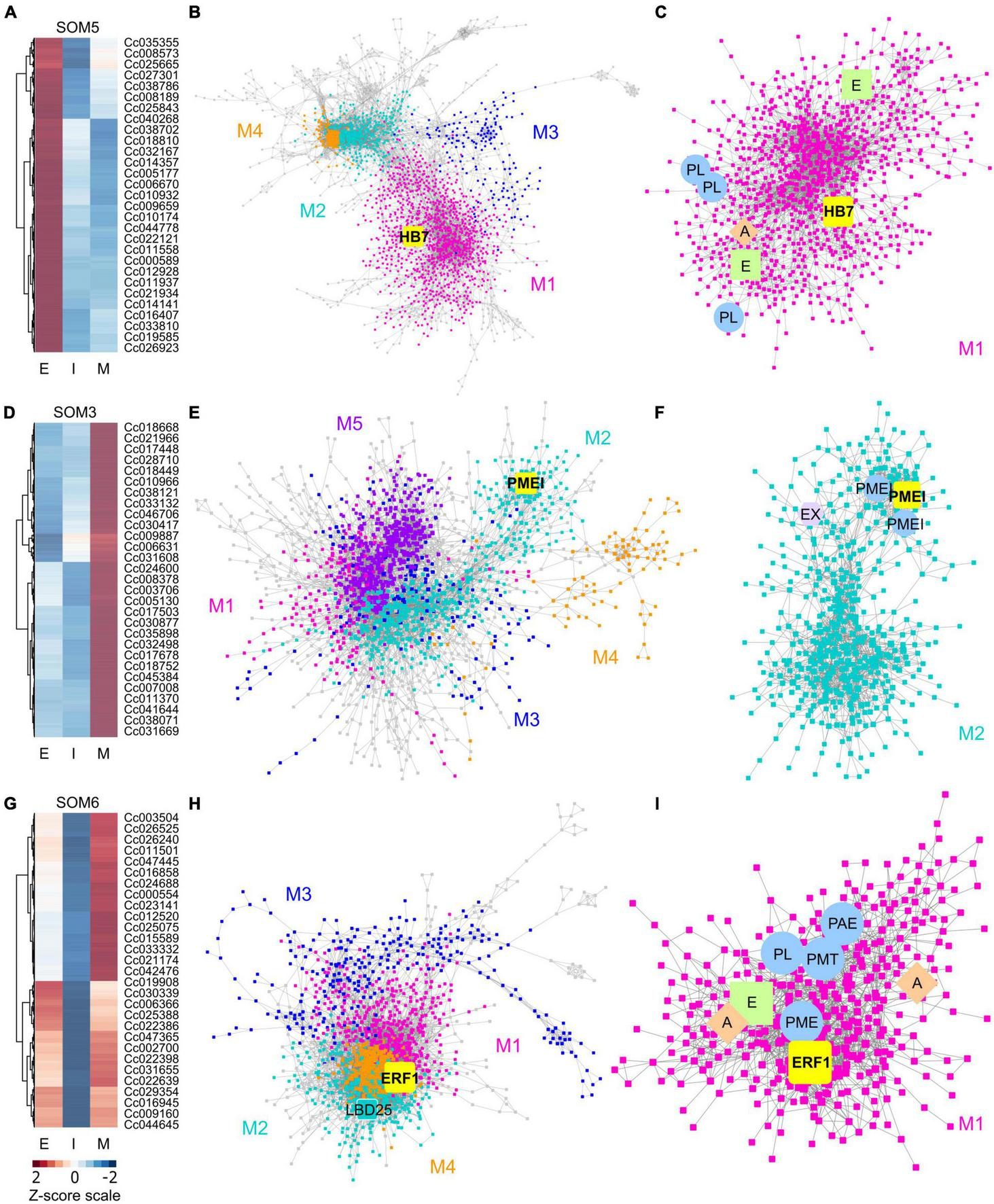 Heatmaps and gene-coexpression networks (GCNs) of C. campestris haustorial tissues across three developmental stages. (A) A heatmap of gene expression profiles in z-scores for SOM5, which includes genes that are highly expressed in the early stage. (B) A GCN of genes in SOM5. This SOM5 GCN is composed of four major modules. Magenta indicates genes in Module 1, which has enriched biological process GO term including “response to abiotic and biotic stimulus, stress, hormone, far-red light.” The transcription factor HB7 is enlarged and labeled in yellow. (C) GCN of genes that are classified in SOM5 Module 1. PL, pectin lyase-like superfamily protein. A, auxin response factor 1. E, ethylene signaling-related genes. (D) A heatmap of gene expression profiles in z-scores for SOM3, which includes genes that are highly expressed in the mature stage. (E) A GCN of genes that are in SOM3. The SOM3 GCN is composed of five major modules. Cyan indicates genes in Module 2, which has enriched biological process GO term including “root radial pattern formation.” Selected pectin methyl-esterase inhibitor (PMEI) is enlarged and labeled in yellow. (F) GCN of genes that are classified in SOM3 Module 2. PMEI, pectin methyl-esterase inhibitor. EX, expansin. (G) A heatmap of gene expression profiles in z-scores for SOM6, which includes genes that are relatively highly expressed in the early and mature stage. (H) A GCN of genes in SOM6. This SOM6 GCN is composed of four major modules. Magenta indicates genes in Module 1, which has enriched biological process GO term including “response to stimulus, hormone, organic substance.” Ethylene responsive element binding factor 1 (ERF1) is enlarged and labeled in yellow. The transcription factor LBD25 is enlarged and labeled in cyan as other genes in Module 2. (I) GCN of genes that are classified in SOM6 Module 1. PL, pectin lyase-like superfamily protein. A, auxin transporter or auxin-responsive protein; E, ethylene signaling-related genes; PL, pectin lyase-like superfamily protein; PME, pectin methylesterase; PMT, pectin methyltransferase-like; PAE, pectin acetylesterase family protein. The complete gene lists for all SOM units with SOM distances and PCA principal component values are included in Supplementary Table 1. The selected SOM gene lists were used for constructing the GCN based on the expression profiles in C. campestris LCM data with the following normal quantile cutoffs. The SOM5 GCN cutoff = 0.97. The SOM3 GCN cutoff = 0.98. The SOM6 GCN cutoff = 0.95.